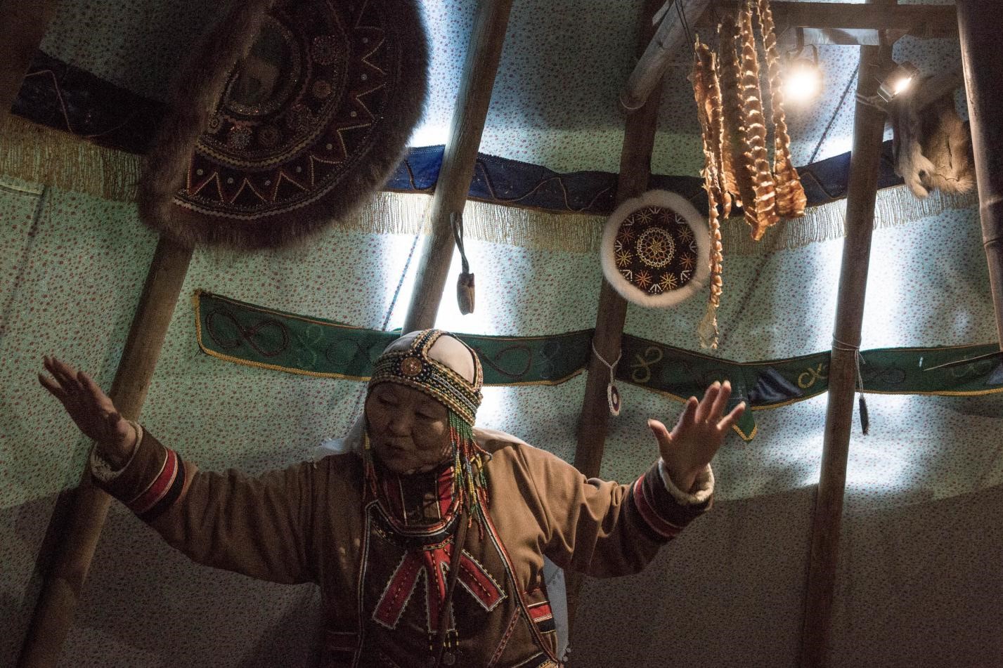 Долганка Светлана демонстрирует обряд очищения «Аластыр», окуривая помещение багульником и можжевельником, и показывает бубен шамана с трёхчастным делением мира.