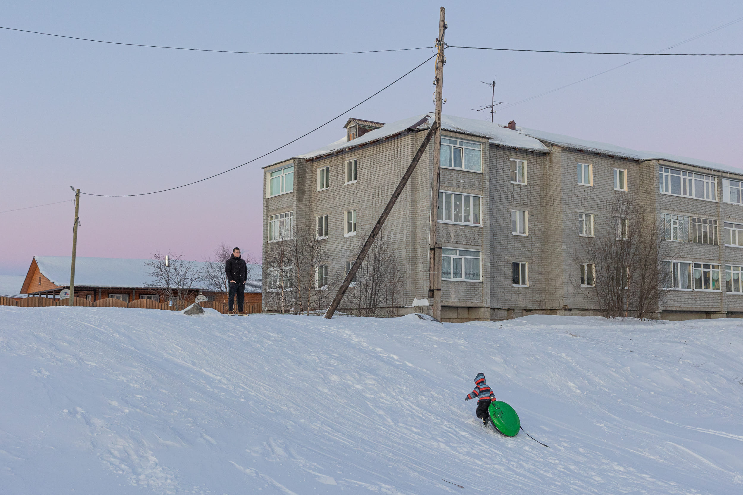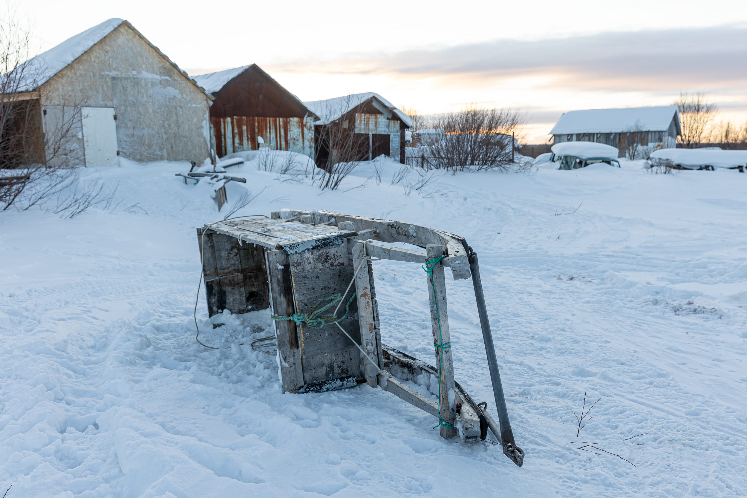 В гаражах на задворках села местные жители держат снегоходы, сани и прочий необходимый инвентарь.
