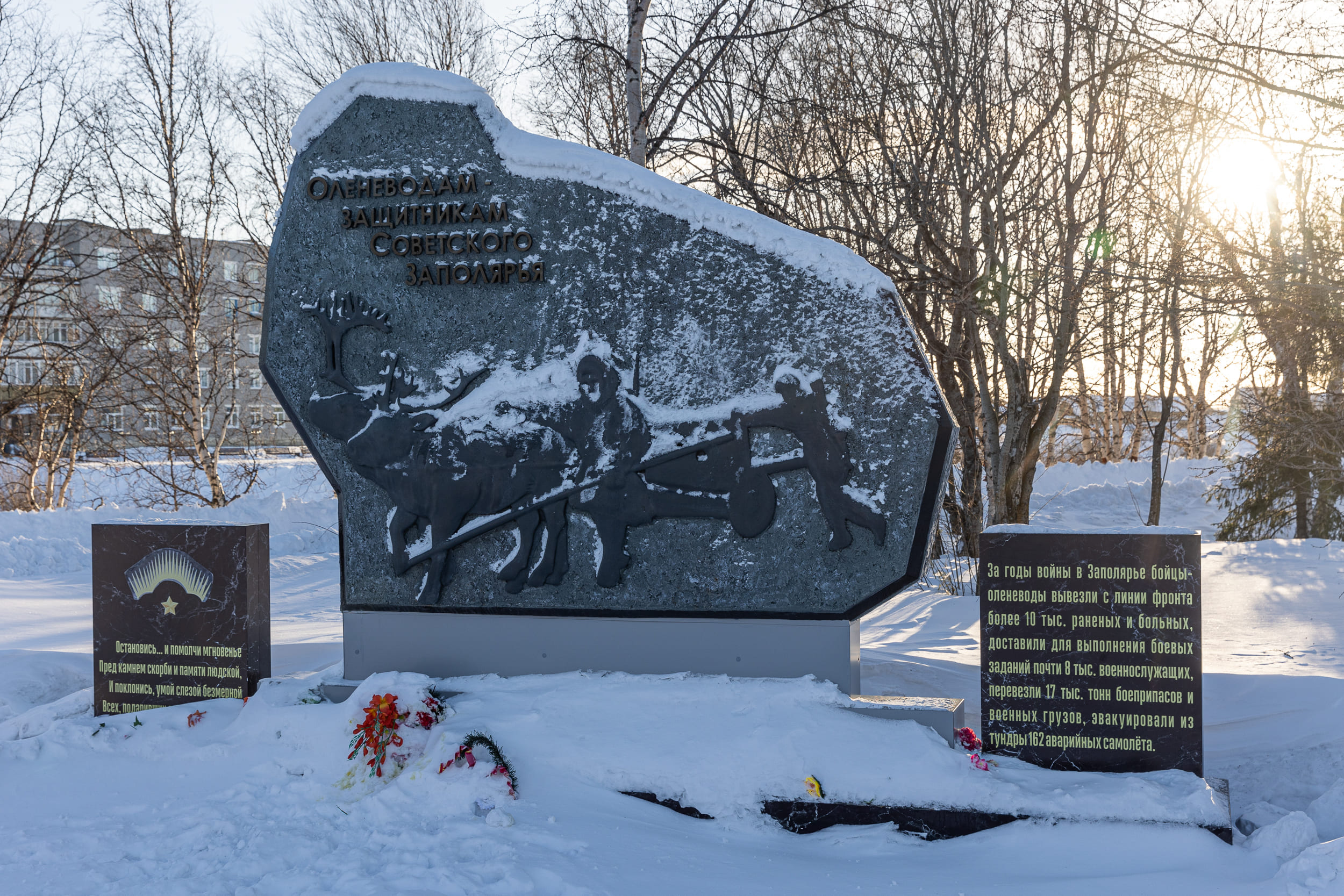 Мемориал в память оленеводам, которые в эпоху Великой отечественной войны были на военной службе в советской армии. Надпись на памятнике: «За годы войны в Заполярье бойцы-оленеводы вывезли с линии фронта более 10 тыс. раненных и больных, доставили для выполнения боевых задач почти 8 тыс. военнослужащих, перевезли 17 тыс. тонн боеприпасов и военных грузов, эвакуировали из тундры 162 аварийных самолета.