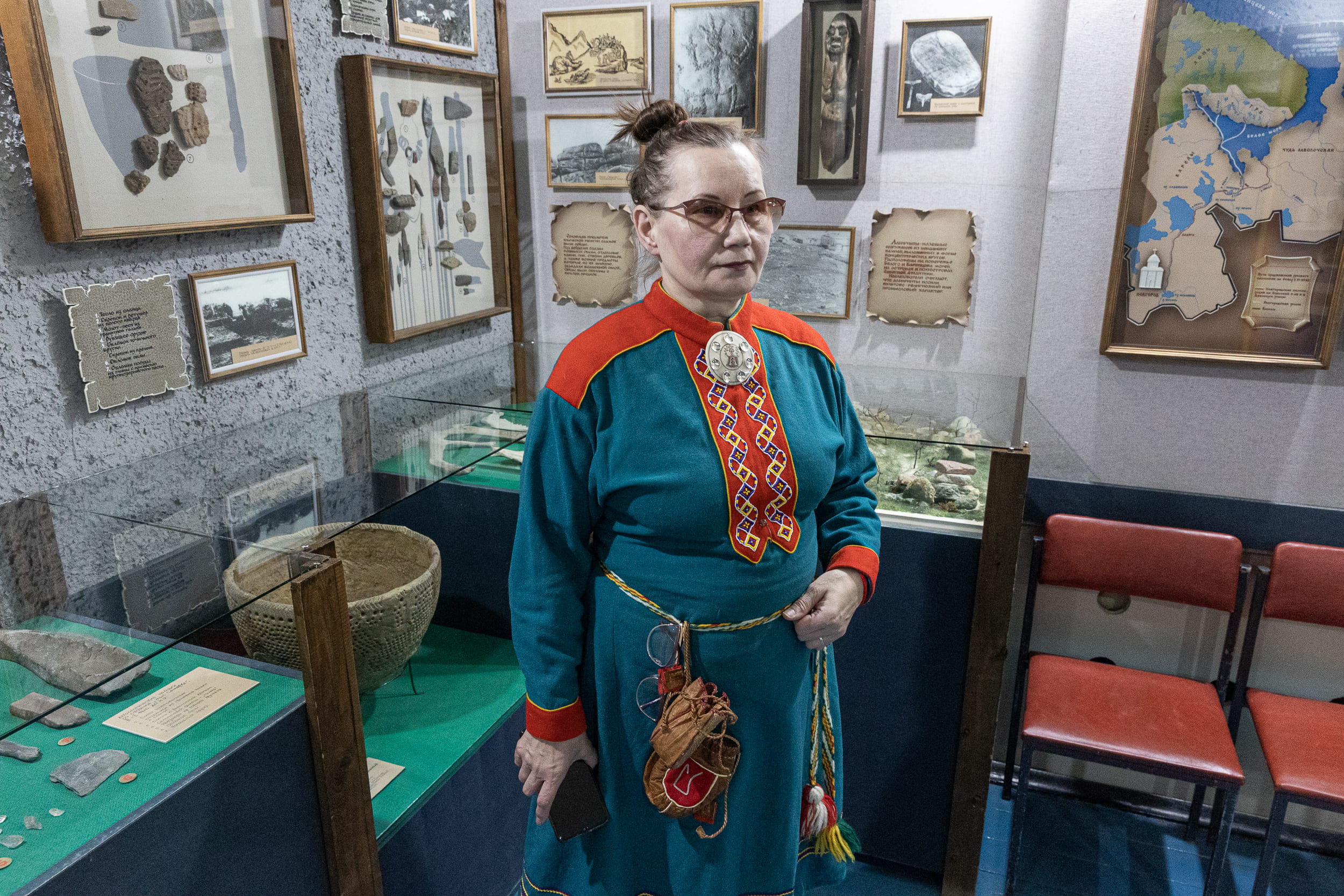 Валентина Совкина, представитель народа саамов, в национальном костюме. Валентина живет в селе Лавозеро и активно борется за сохранение культуры и образа жизни своего народа.