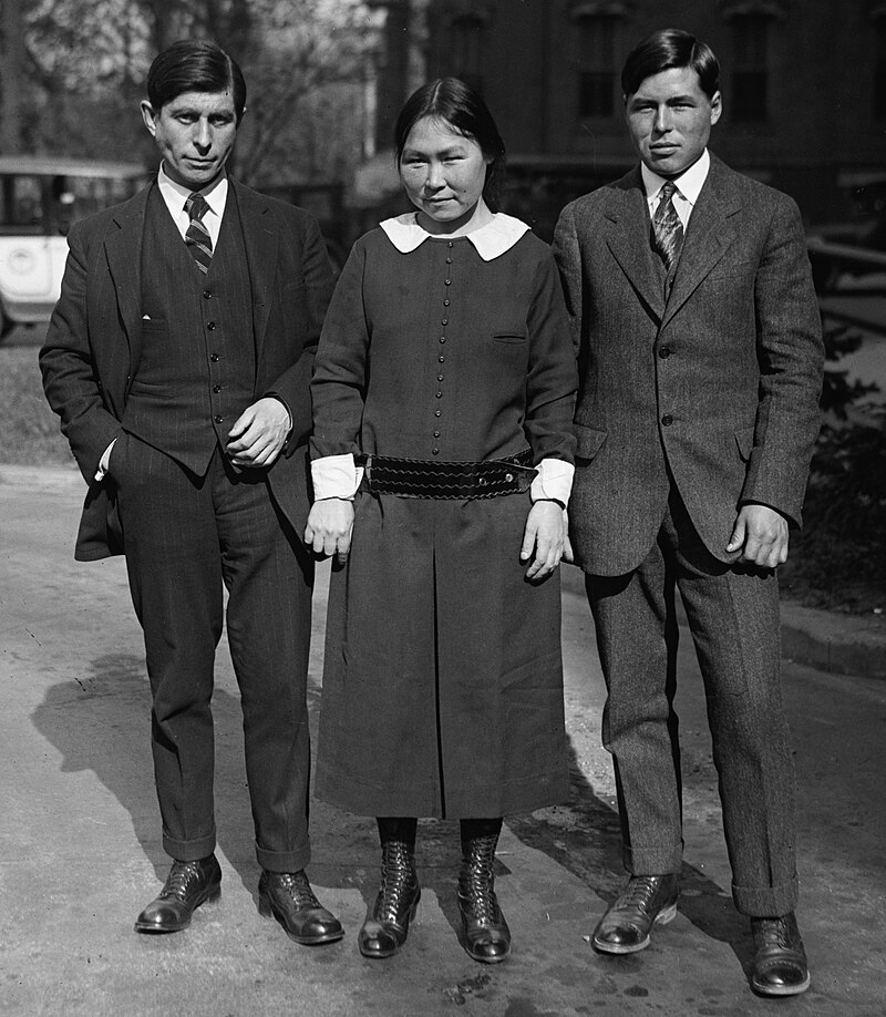 Датско-гренландский исследователь Кнуд Расмуссен (1879-1933) со спутниками-инуитами, г-жой Арналулунгуак и г-н. Митек, 3 ноября 1924 года. Источник: Wikimedia Commons