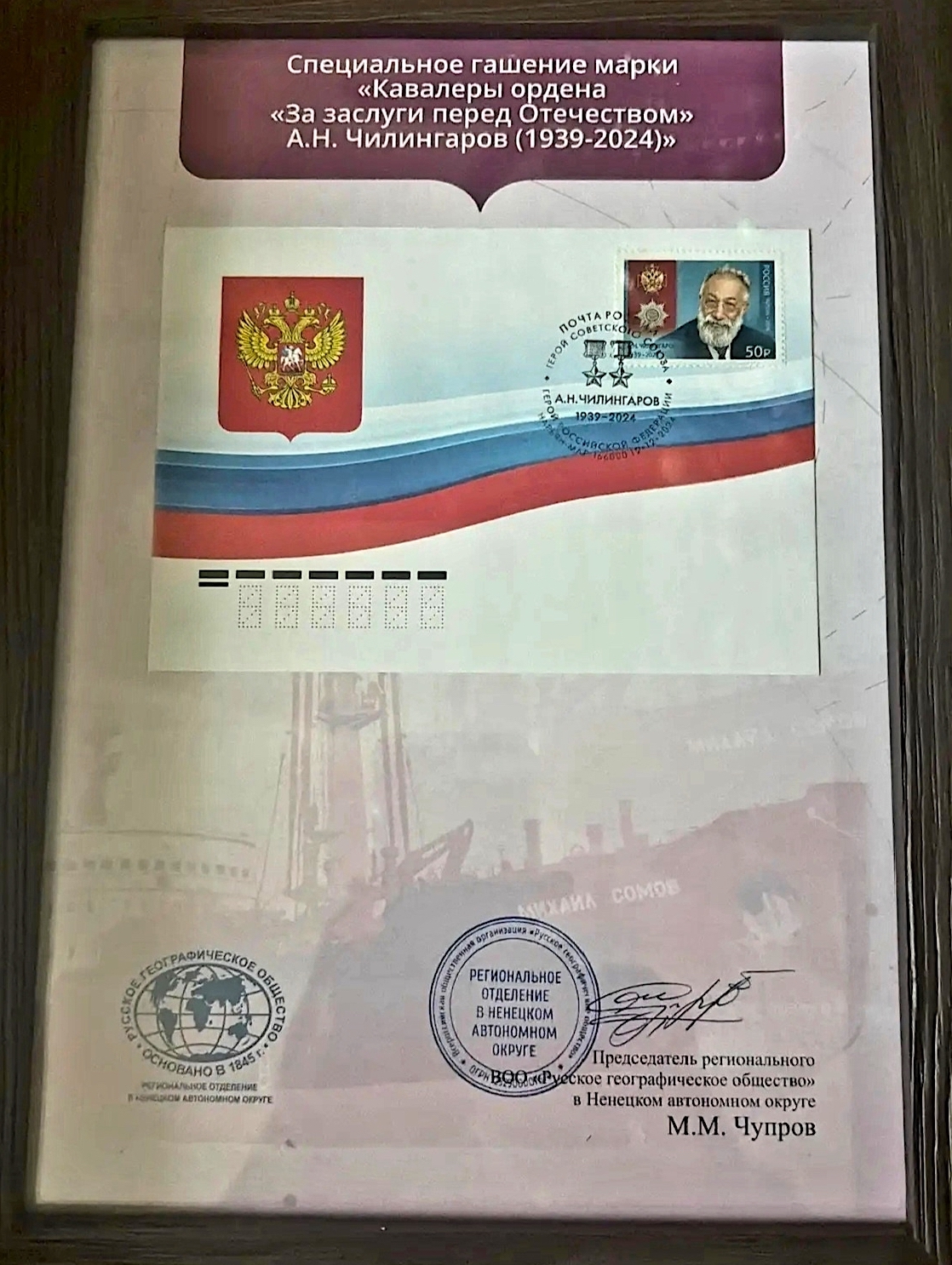 Второй дар ненецкого отделения РГО уфимскому музею – почтовый конверт и марка со специальным гашением, которое было проведено в Нарьян-Маре 12 декабря 2023 года к 30-летию первого избрания Артура Николаевича Чилингарова депутатом Государственной Думы от НАО. Особенностью штемпеля, использованного только в НАО, является изображение двух звёзд Героя, что делает эти маркированные конверты филателистической редкостью. Общее количество марок со специальным гашением – около ста экземпляров.
