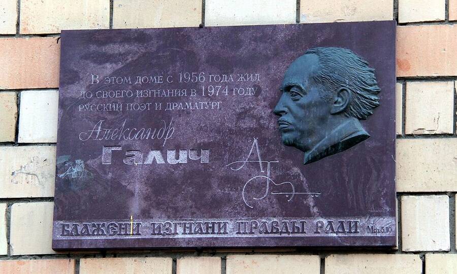 Мемориальная доска на стене дома в Москве, в котором Александр Галич жил до отъезда из СССР. Источник: www.sakharov-center.ru