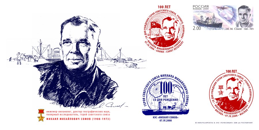 А еще в 1980 году Почта СССР выпустила марку, посвященную научно-экспедиционному судну «Михаил Сомов» (постройки 1975 года), которое ходит до сих пор. На марке – барельеф М.М. Сомова