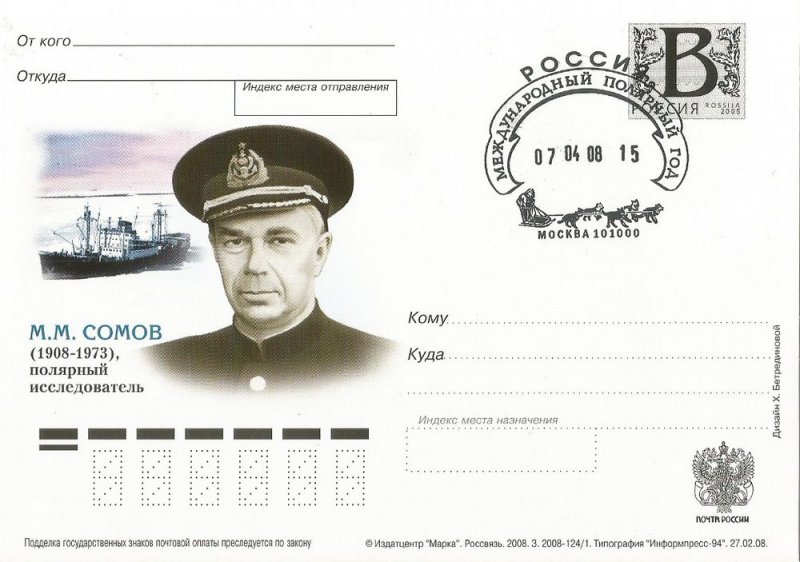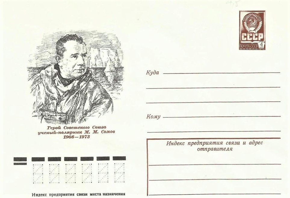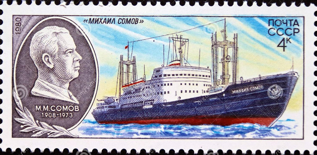 А еще в 1980 году Почта СССР выпустила марку, посвященную научно-экспедиционному судну «Михаил Сомов» (постройки 1975 года), которое ходит до сих пор. На марке – барельеф М.М. Сомова