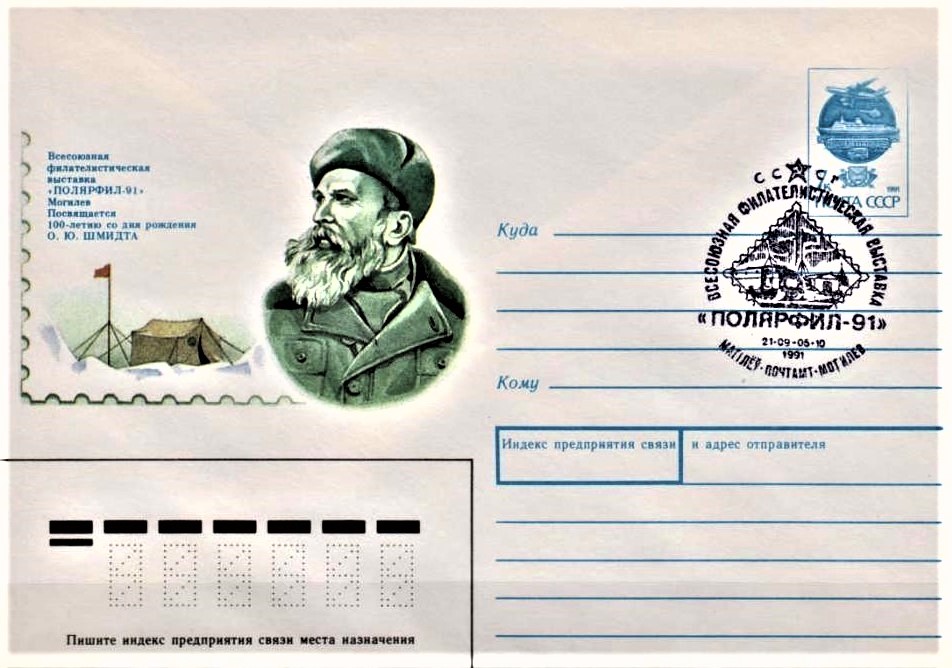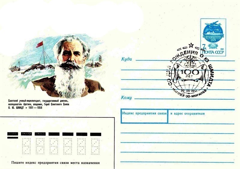 В 1991 году Минсвязи СССР выпустило художественный маркированный конверт, посвященный 100-летию со дня рождения О.Ю. Шмидта, а в Могилеве, на малой родине Отто Юльевича, 30 сентября 1991 года состоялось специальное гашение – последнее в истории Советского Союза
