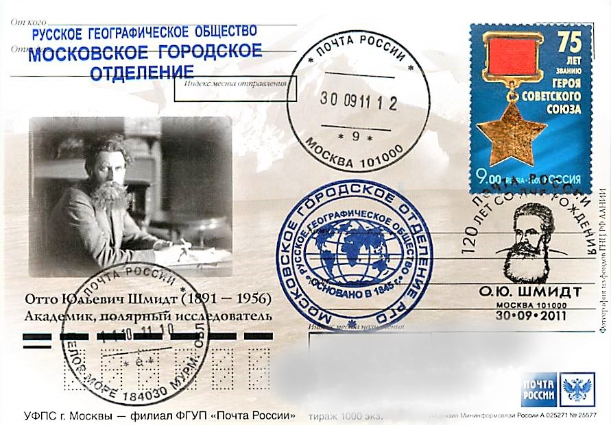 В 2011 году Почта России выпустила почтовую карточку, посвященную 120-летию со дня рождения О.Ю. Шмидта, а в Москве состоялось специальное гашение в честь этой даты