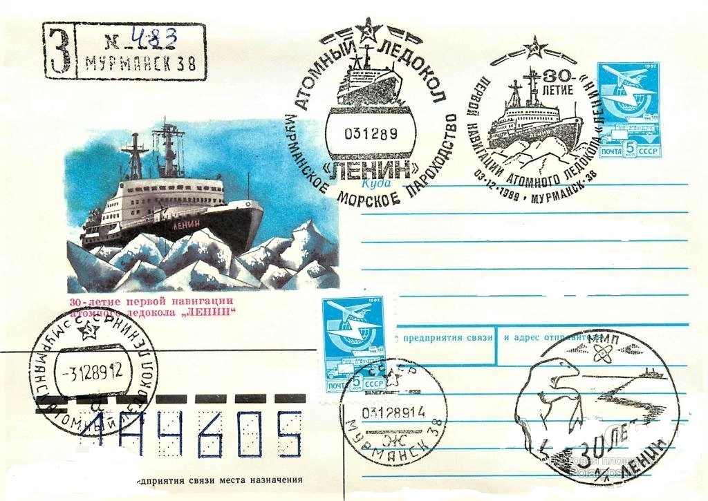Почтовый конверт Минсвязи СССР 1989 года, посвященный 30-летию первой навигации атомного ледокола «Ленин», со спецгашениями места его вечной стоянки - Мурманска