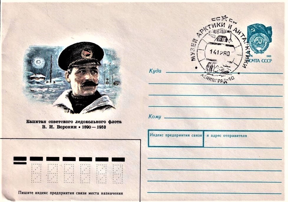 Маркированный конверт Минсвязи СССР 1990 года, посвященный 100-летию со дня рождения В.И. Воронина, со штемпелем Музея Арктики и Антарктики