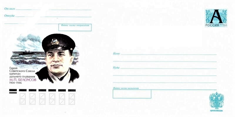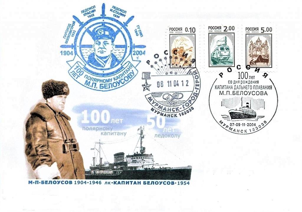 Маркированный конверт Почты России 2004 года, посвященный 100-летию со дня рождения М.П. Белоусова