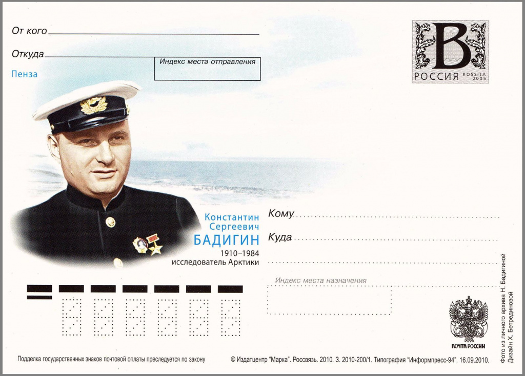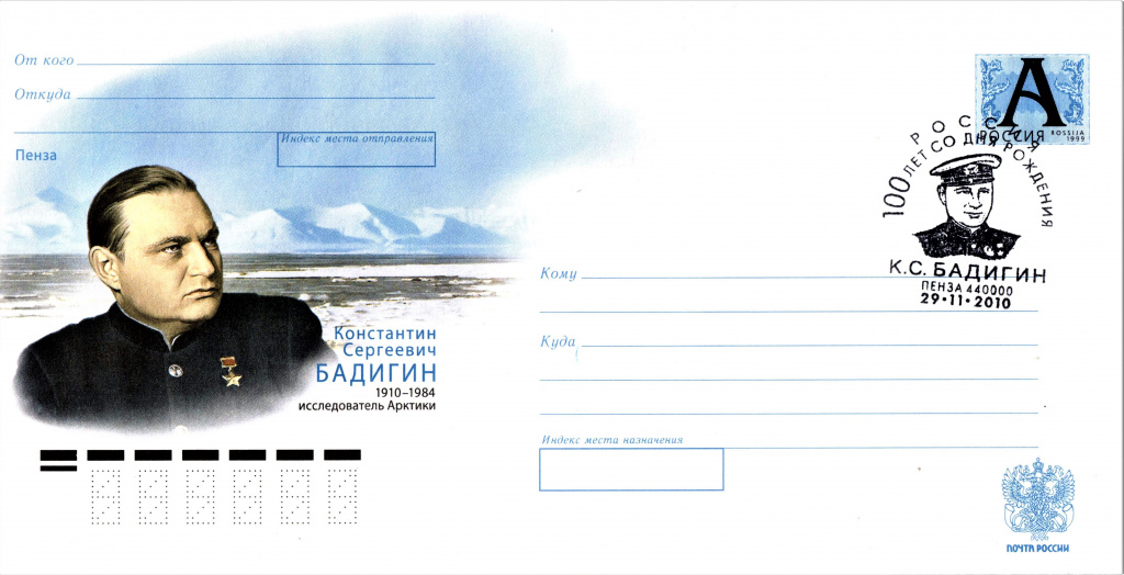 Маркированная односторонняя карточка Почты России 2010 года, посвященная 100-летию со дня рождения К.С. Бадигина