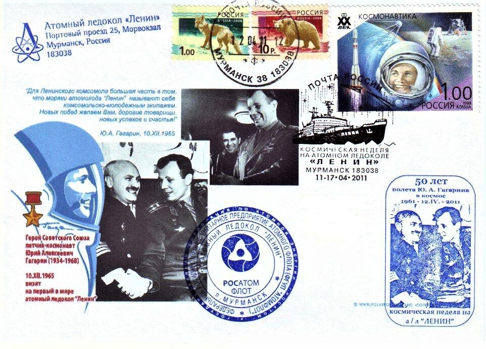 На конверте 2011 года – Ю.С. Кучиев и первый космонавт планеты Ю.А. Гагарин во время посещения в 1965 году атомохода «Ленин»