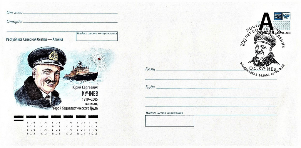 Маркированный конверт Почты России 2019 года и спецгашение, посвященные 100-летию со дня рождения Ю.С. Кучиева
