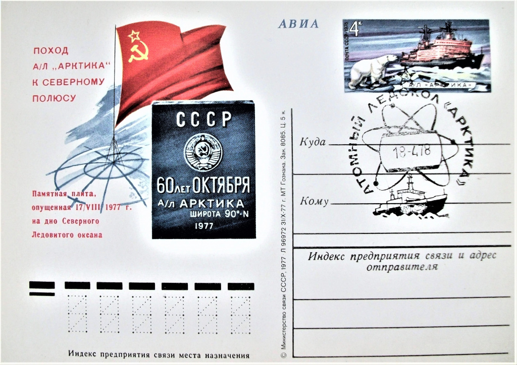 Почтовая карточка с оригинальной маркой Минсвязи СССР 1977 года, посвященная походу атомного ледокола «Арктика» к Северному полюсу и погашенная штемпелем этого судна