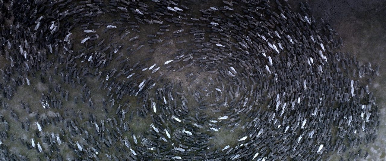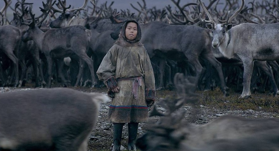 Будущий шаман Игорёк, окружённый оленями, смотрит на нас. Кадр из фильма «Цинга»