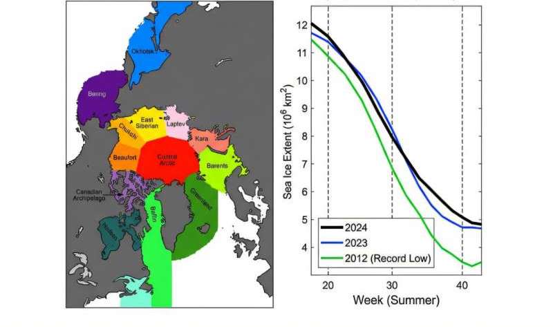 Исследованные арктические регионы (слева) и график сезонного сокращения общей площади арктического морского льда во время летнего таяния (справа) за 2024, 2023 годы и рекордно низкий показатель 2012 года (по вертикали отмечены значения площади морского льда, по горизонтали – недели лета). Источник: В. Кондрашов и др. / phys.org