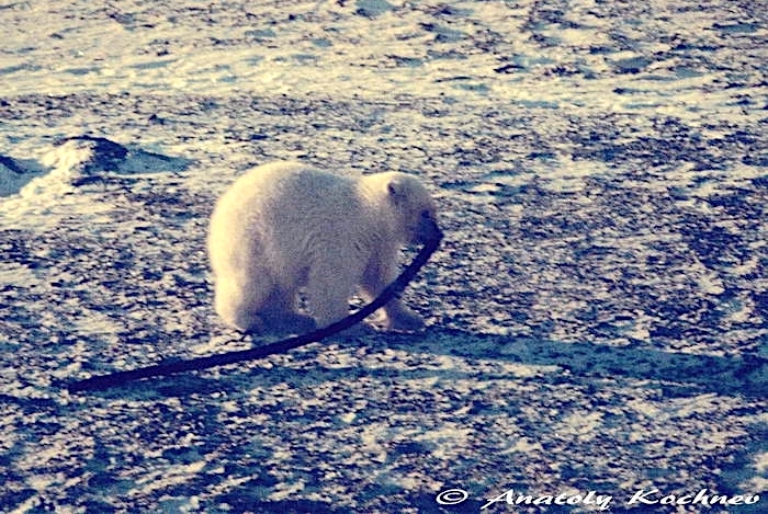 Связь с Большой землёй на острове Врангеля поддерживалась через радиостанцию с антенной. Однажды утром рация замолчала. Выбравшись наружу, учёный увидел в 20 метрах парочку знакомых животных – медведицу с медвежонком, которые с упоением перетягивали друг у друга провод антенны. Биолог с палкой в руках стал гоняться за воришками, чтобы вернуть средство связи. Медведи восприняли погоню как весёлую игру: стоило человеку остановиться перевести дух, они замедлялись и оглядывались, словно приглашая продолжить. Провод удалось отобрать, а потом пришлось каждую ночь убирать его в дом.