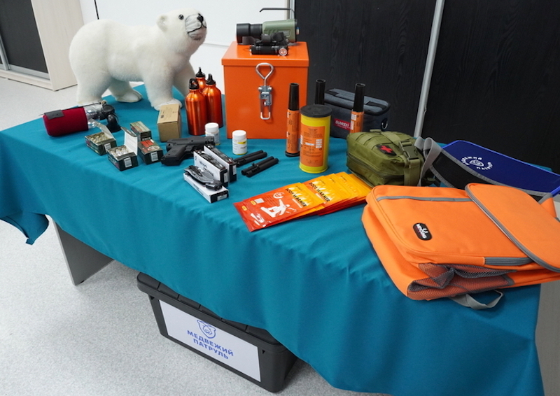 Первый комплект средств для обеспечения безопасности при встрече с белыми медведями, разработанный специалистами АНО «Чистая Арктика» для проекта «Медвежий патруль», передан инспекторам национального парка «Русская Арктика». В комплект входят пневматический звуковой сигнал, дальнобойный фонарь, ракетница, дымовая шашка, фальшфейеры, аптечка первой помощи и памятки с алгоритмами действий при встрече с медведями и правилами оказания помощи пострадавшим. По словам координатора проекта «Медвежий патруль» в АНО «Чистая Арктика» Александра Маркова, при комплектовании набора учитывалось, что белые медведи привычны к громким звукам, похожим на взрывы, – так постоянно шумит, лопаясь и трескаясь, морской лёд. Поэтому больше, чем выстрелов, животные боятся внезапных ярких вспышек, горения и необычных неприятных запахов.