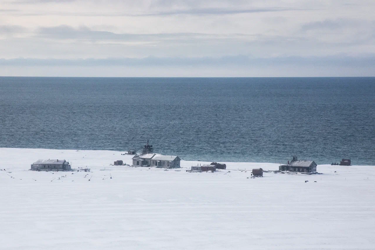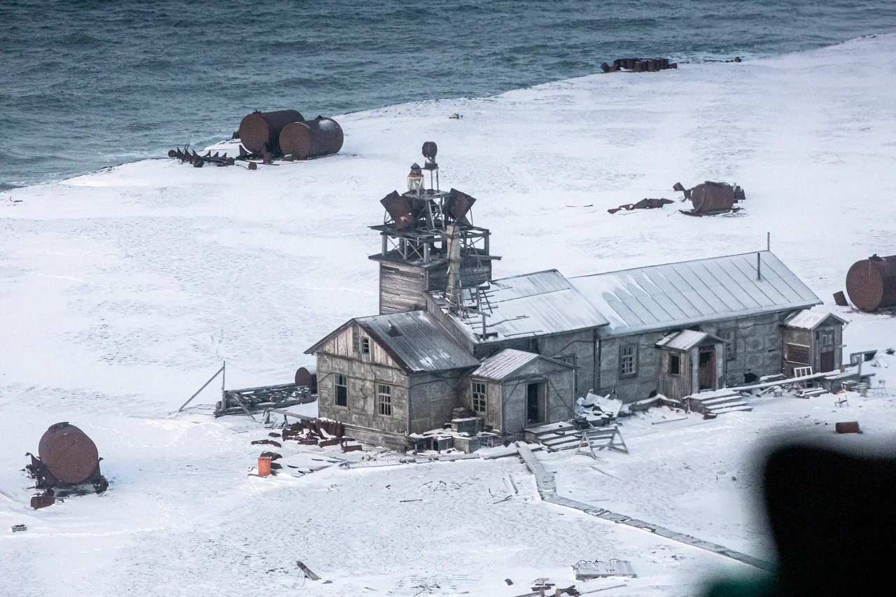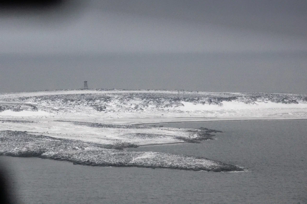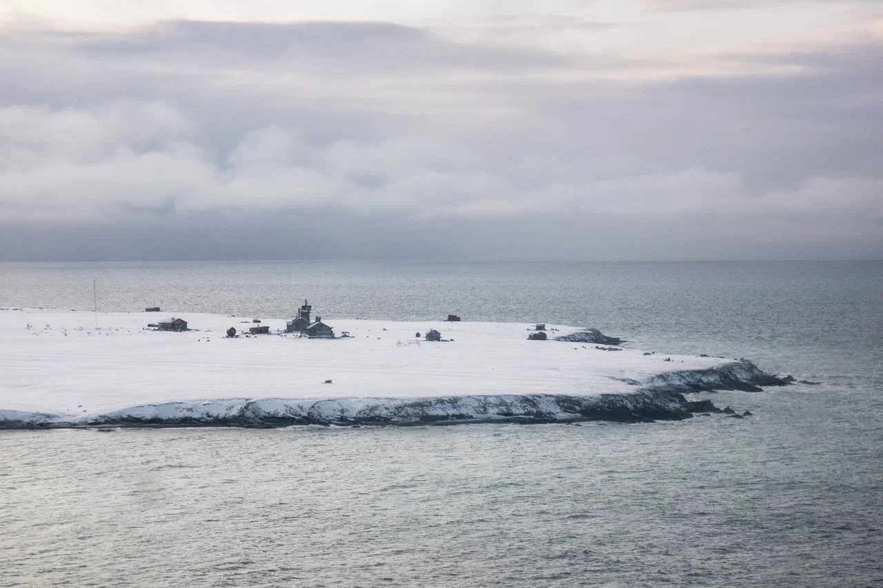 Мы летели вдоль прямой линии побережья острова Русский, любуясь сверху на омывающие берега зеленоватые воды Карского моря, пока вдалеке не показались строения метеостанции и центральное её здание с маяком на башне, напоминающее издалека деревянную церквушку.
