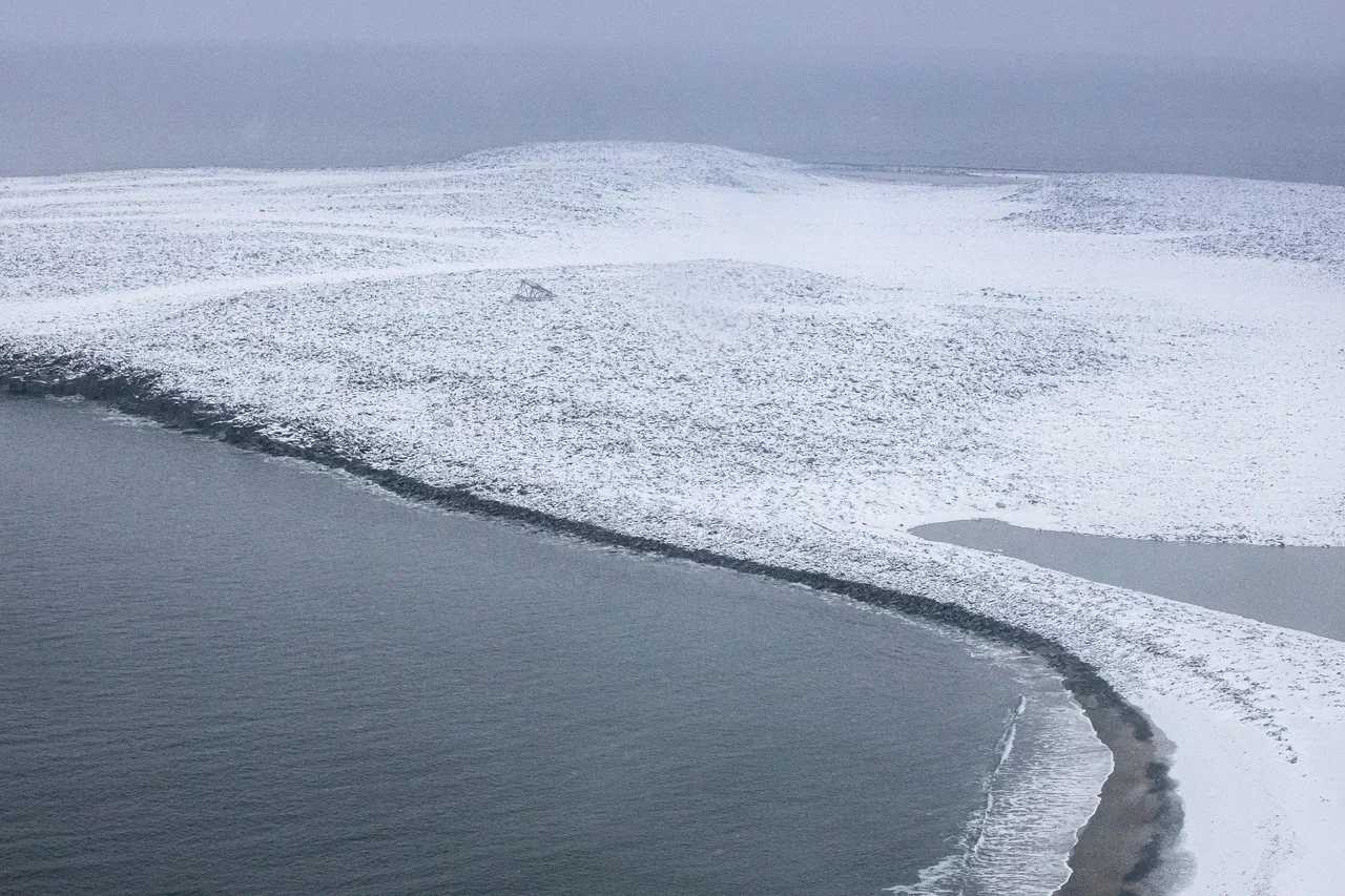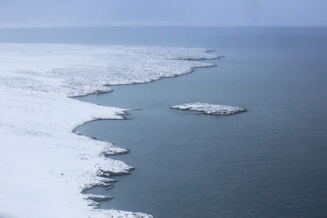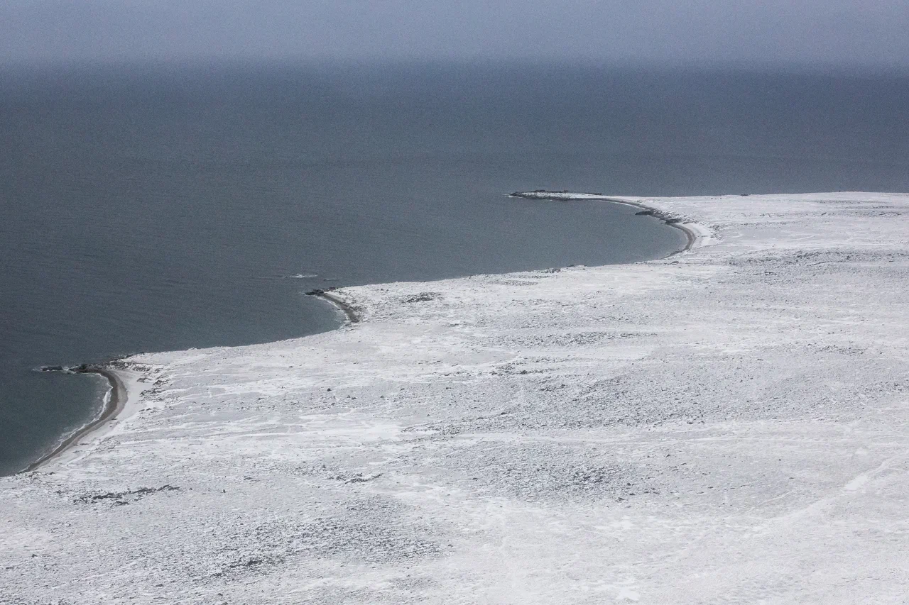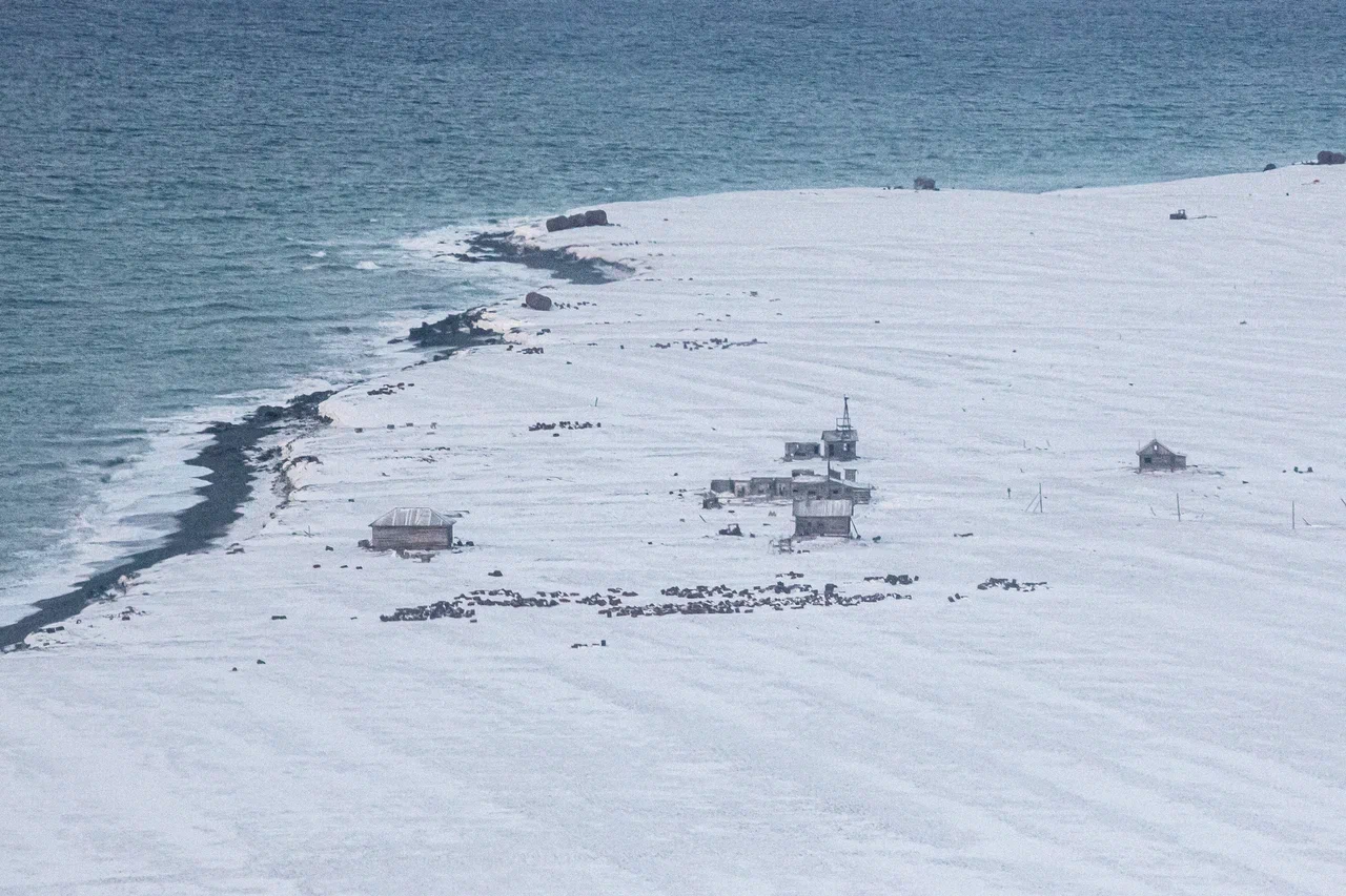 Мы летели вдоль прямой линии побережья острова Русский, любуясь сверху на омывающие берега зеленоватые воды Карского моря, пока вдалеке не показались строения метеостанции и центральное её здание с маяком на башне, напоминающее издалека деревянную церквушку.