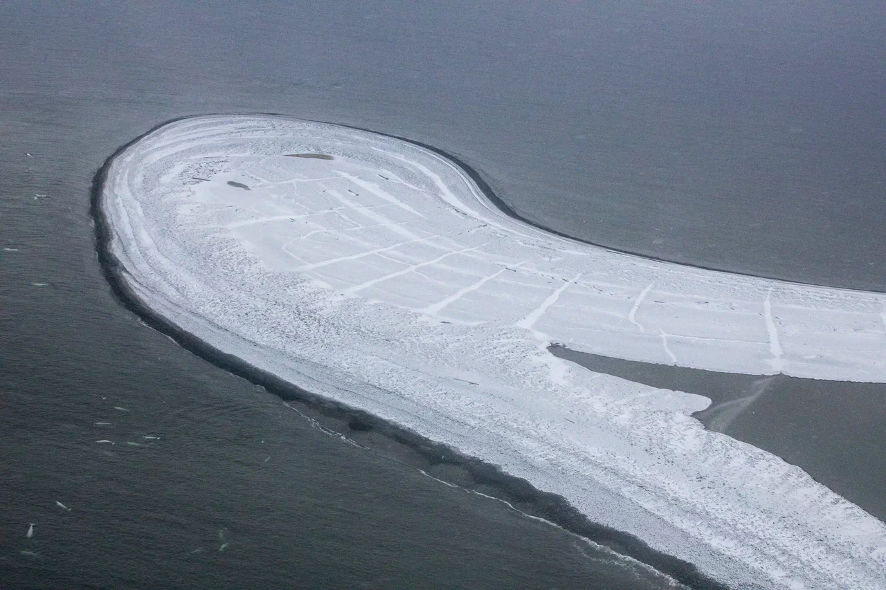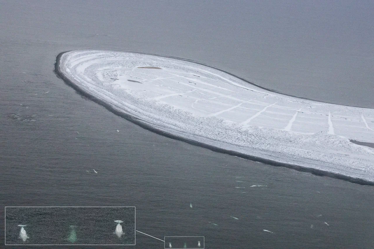 Здесь нас ждала неожиданная встреча – у берегов острова Ермак на мелководье мы увидели целую стаю белух. На фотографии видны их светлые силуэты возле побережья острова. Нам посчастливилось увидеть этих животных накануне миграции в Баренцево море, где они проводят зиму. В апреле-мае белухи, огибая с севера Новую Землю, проникают из Баренцева моря в Карское. Здесь они проводят лето и до конца сентября охотятся в заливах и приустьевых участках рек. Остров Ермак назван в честь ледокола «Ермак», носившего имя русского землепроходца Ермака Тимофеевича, – неровный и скалистый с характерным остроконечным мысом.