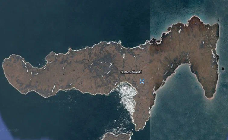 Остров Бианки – один из самых крупных островов Восточной группы и архипелага в целом. Он был открыт и нанесён на карты в 1901 году русским исследователем Фёдором Матисеном и назван в том же году Э.В. Толлем в честь русского зоолога, орнитолога и энтомолога Валентина Львовича Бианки, отца известного детского писателя Виталия Бианки. Остров вытянут с запада на восток и имеет форму лежащей на боку буквы F. Из вертолёта мы не могли охватить взглядом весь остров, но на спутниковых снимках латинская буква читается отчетливо. Длина этого острова около 13 км, ширина достигает 5,5 км. На острове есть три возвышенности высотой 42 метра (западная), 97 метров (центральная) и 61 метр (восточная). По максимальной высоте остров Бианки уступает в архипелаге Норденшёльда только острову Чабак (107 метров). С возвышенностей к северному и к южному побережью острова стекает несколько мелких, перемерзающих зимой безымянных ручьёв. В западной части ближе к центру лежит несколько небольших бессточных озёр. Прибрежные районы ручьёв и озёр частично заболочены. Но в день нашего полета, 28 сентября, остров был припорошен снегом, и мы могли рассмотреть на нем лишь каменистые россыпи.