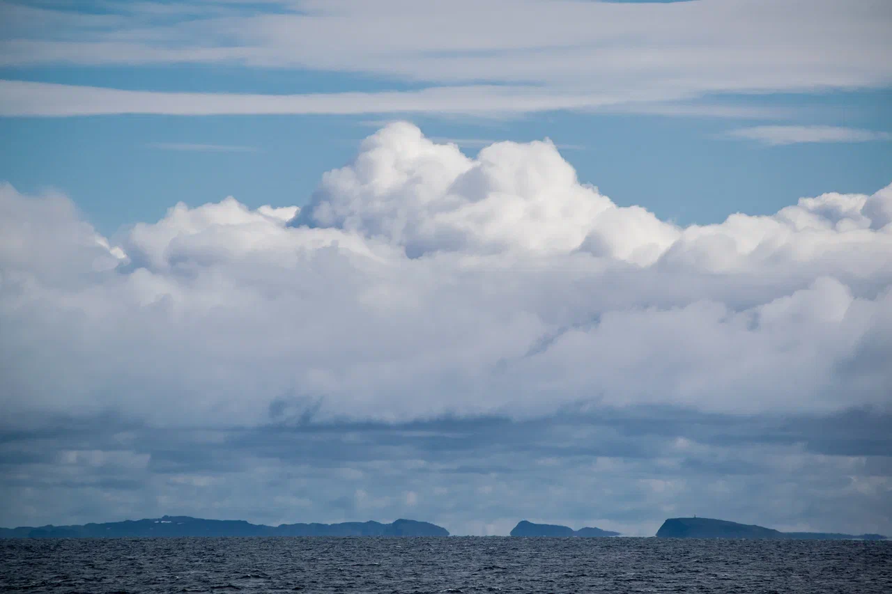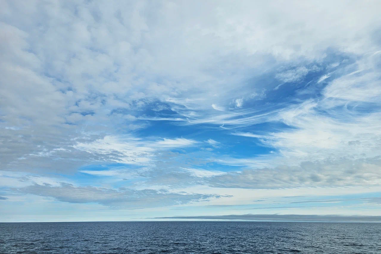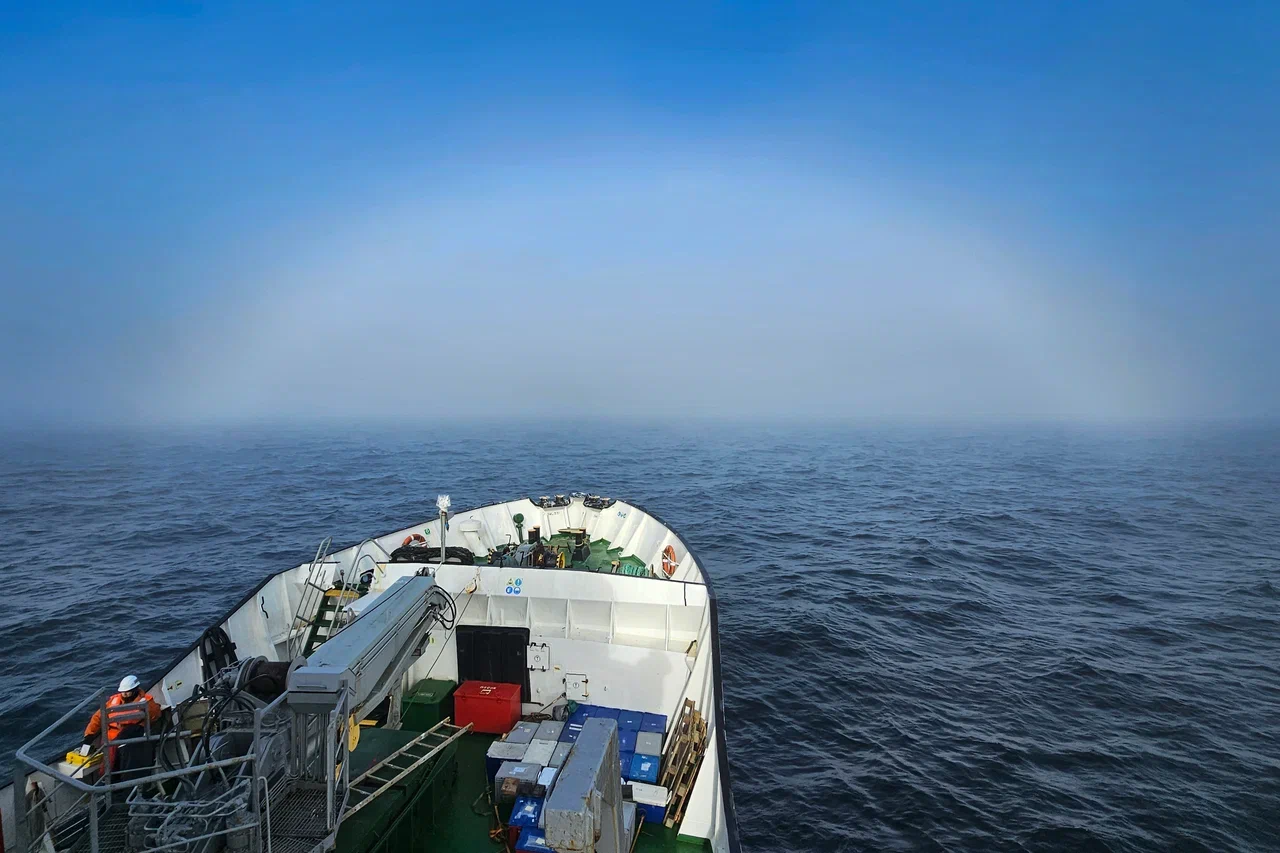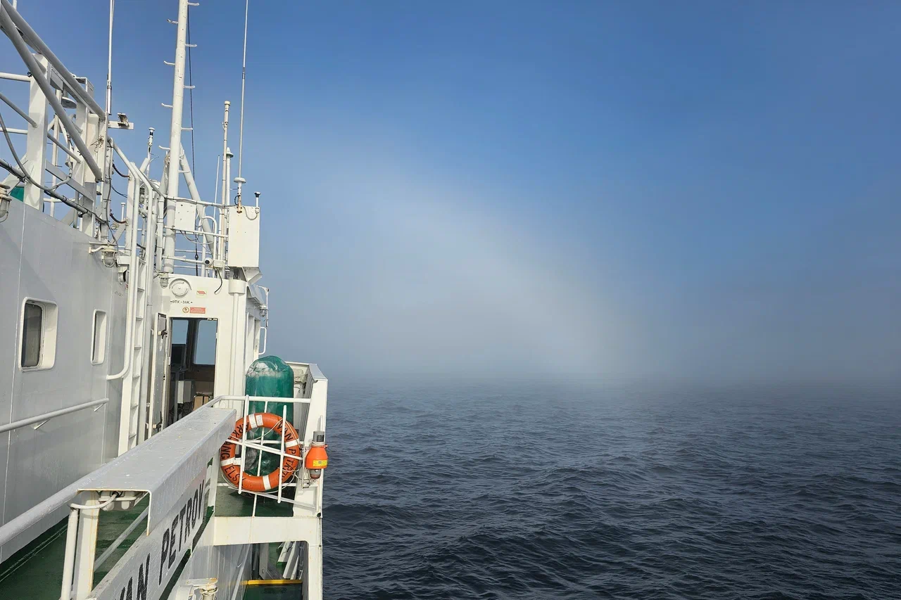 Вскоре погода начала меняться, причём менялась она довольно быстро и многократно в течение дня. К примеру, с утра светит солнце, и стрелка барометра движется вправо – давление растёт. Потом на горизонте появляется похожая по форме на купол область белого цвета. Этот купол начинает стремительно расти и оказывается всё поглощающим туманом. Через полчаса уже почти ничего не видно дальше 20-30 метров от борта. Зато сверху по-прежнему проглядывает часть синего неба, и проникают лучи солнца. А потом всё так же стремительно исчезает, чтобы через час повториться снова.