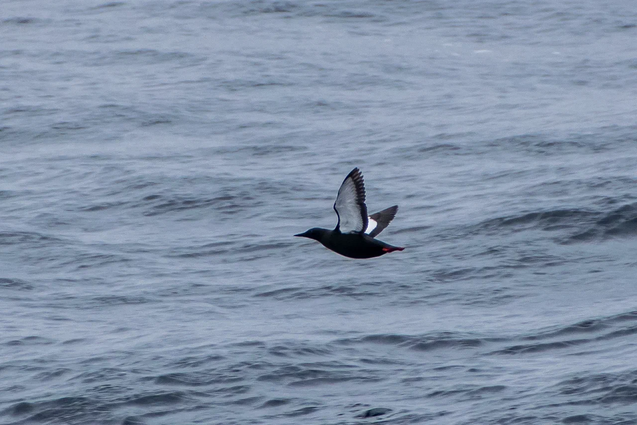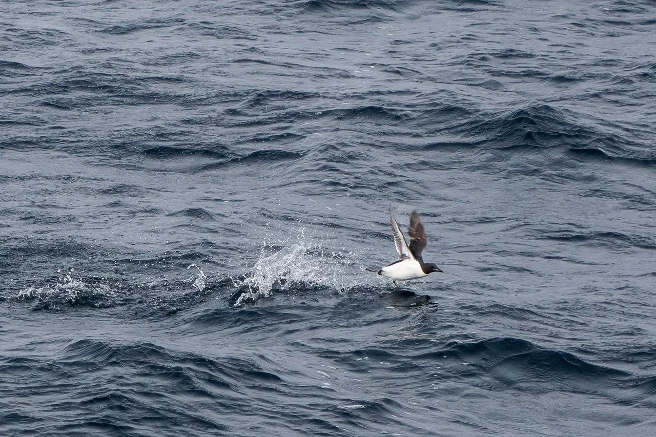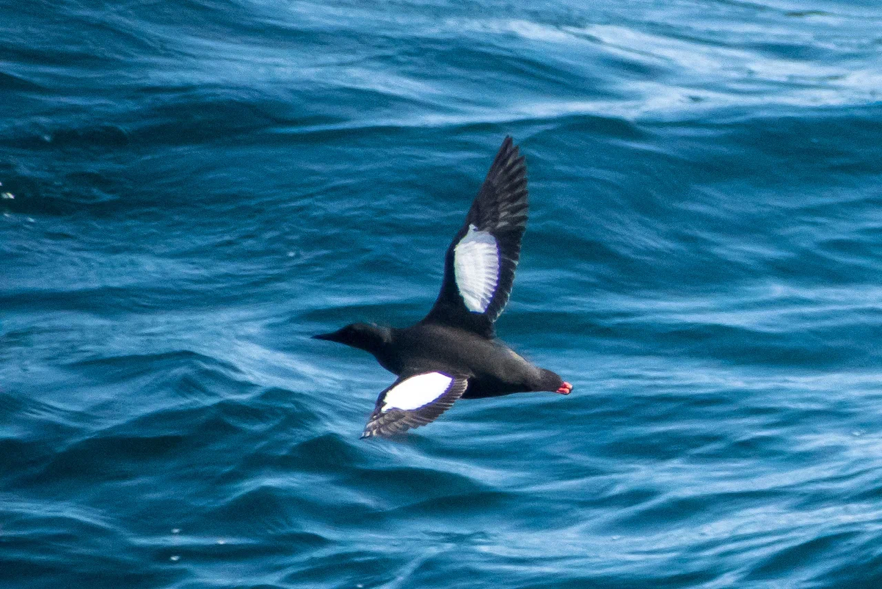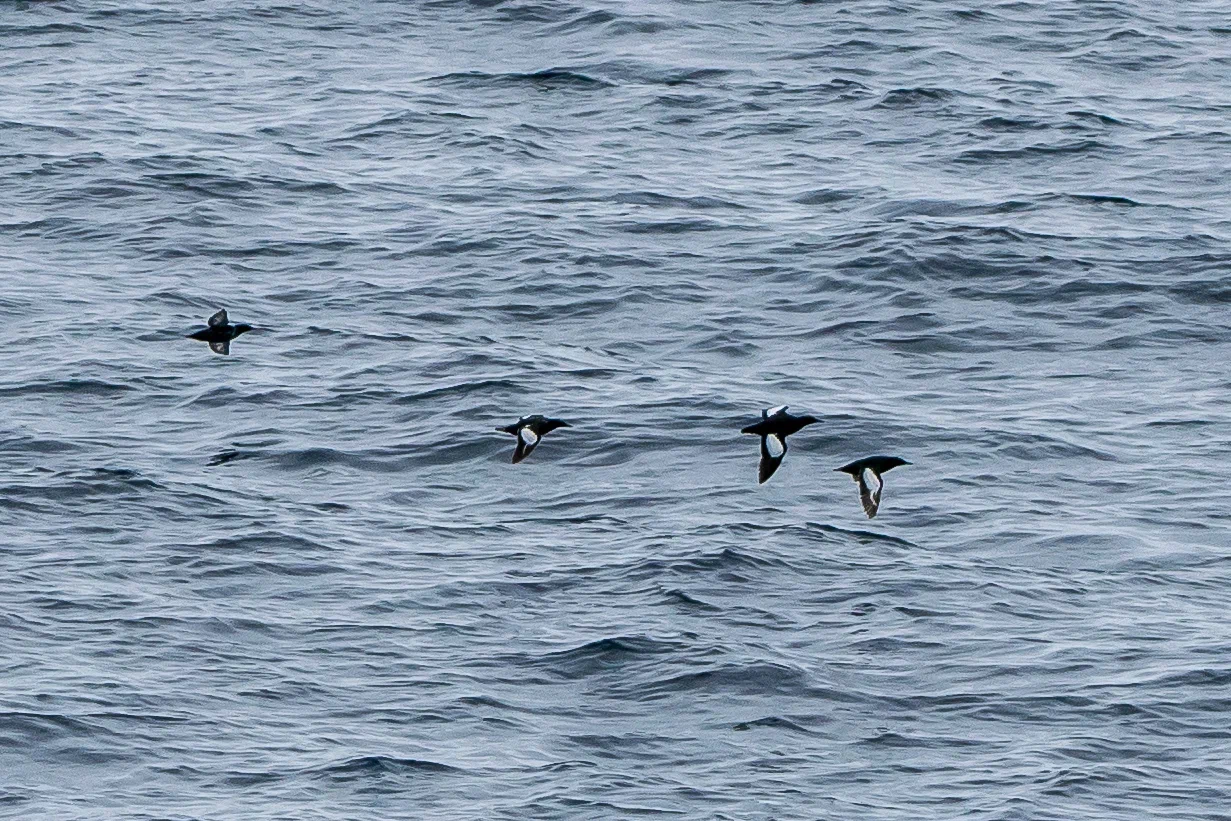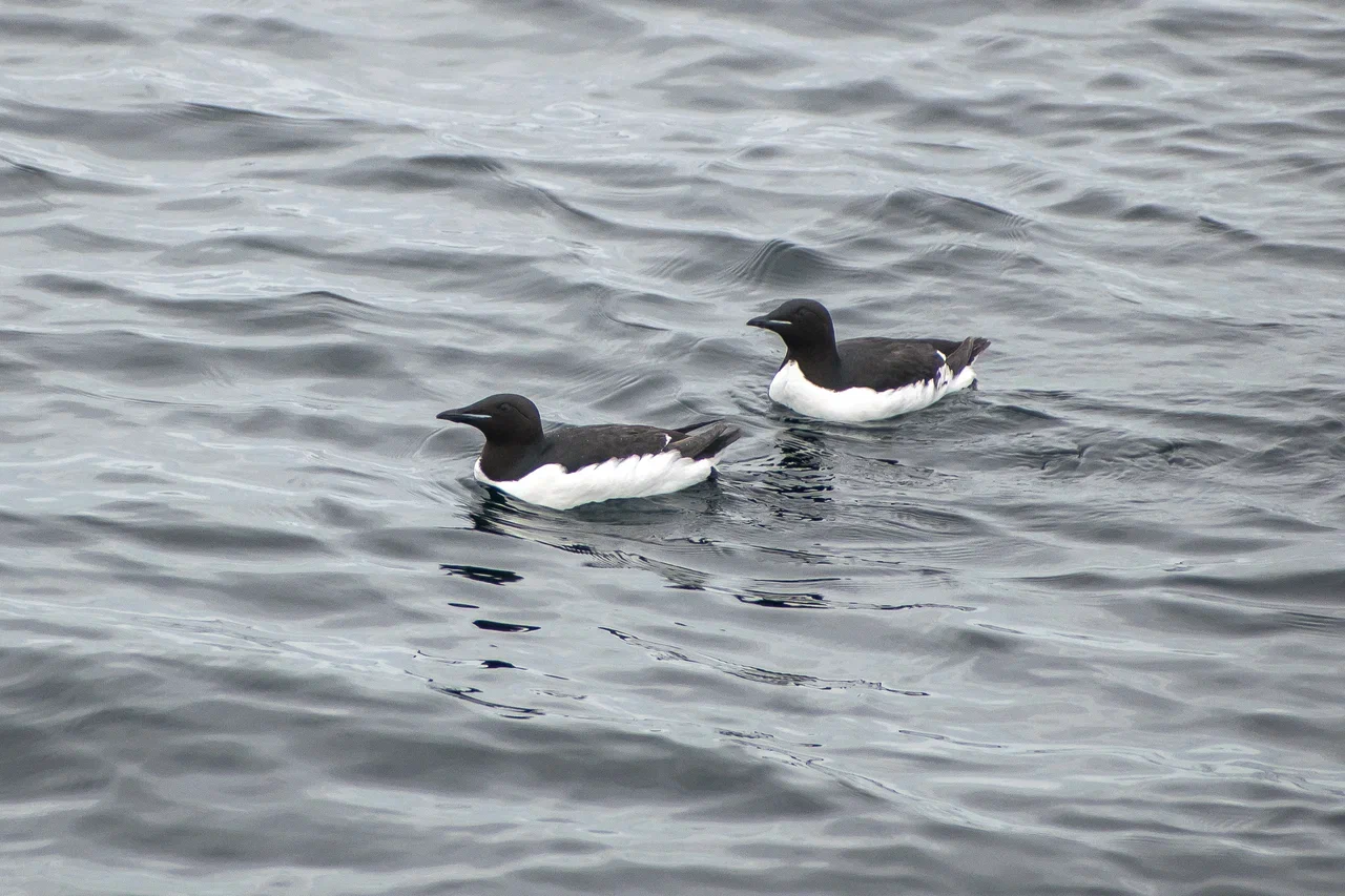 Первыми многочисленными птицами, которых мы встречали даже в густом тумане, были чистики. Летом в брачном наряде они имеют полностью чёрное оперение с большим белым пятном на крыле. Эти очень проворные птицы постоянно заныривали, завидев наше судно, или улетали, оттолкнувшись от воды своими ярко-красными ногами.