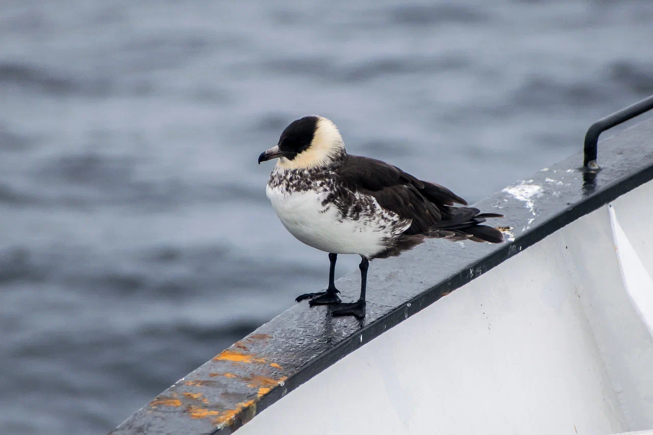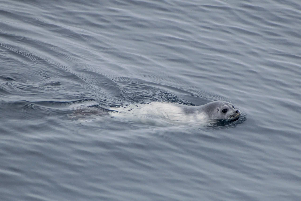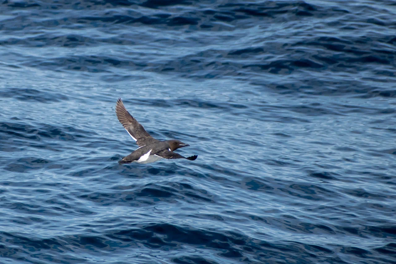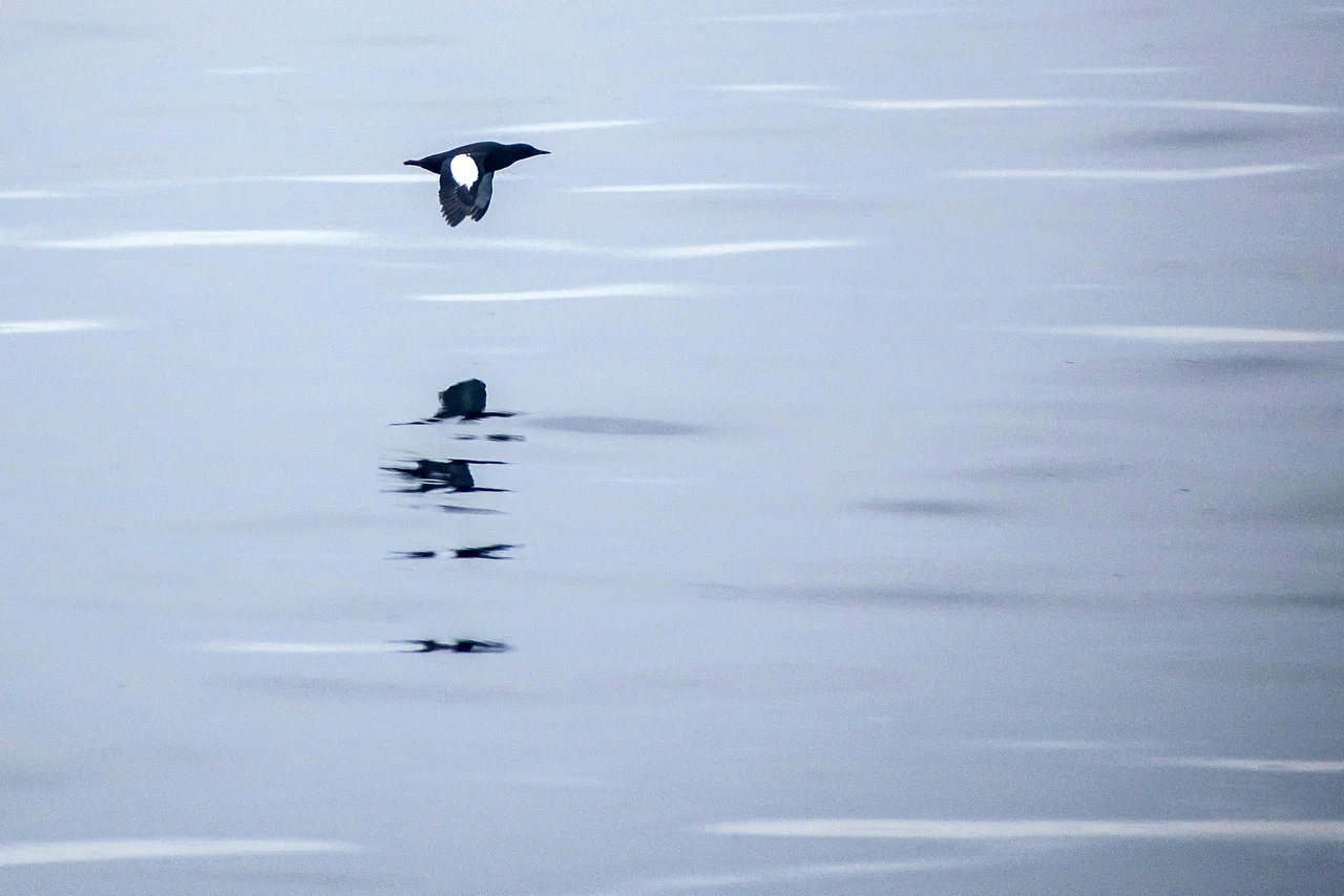 Первыми многочисленными птицами, которых мы встречали даже в густом тумане, были чистики. Летом в брачном наряде они имеют полностью чёрное оперение с большим белым пятном на крыле. Эти очень проворные птицы постоянно заныривали, завидев наше судно, или улетали, оттолкнувшись от воды своими ярко-красными ногами.