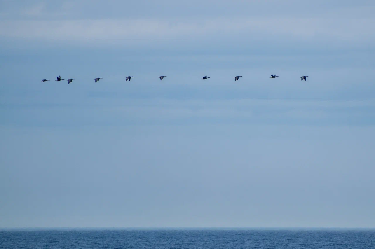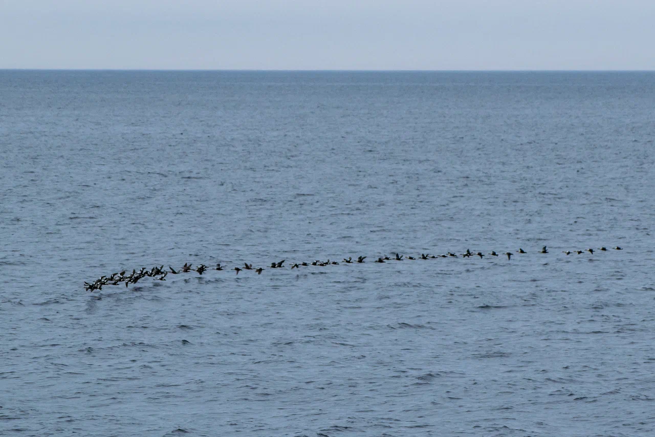 Работая в центре Баренцева моря вдали от берегов, мы наблюдали в основном морских птиц, к которым традиционно относят виды, проводящие в море большую часть годового цикла. С сушей морские птицы связаны исключительно в период размножения. А вот в Карском море картина была другая – здесь помимо морских птиц, мы часто встречали водоплавающих и околоводных птиц, мигрирующих между полуостровом Ямал, островом Вайгач и архипелагом Новая земля. Наша работа проходила в западной части Карского моря, и когда наше судно приближалось к берегу, мы наблюдали мигрирующие стаи водоплавающих птиц.