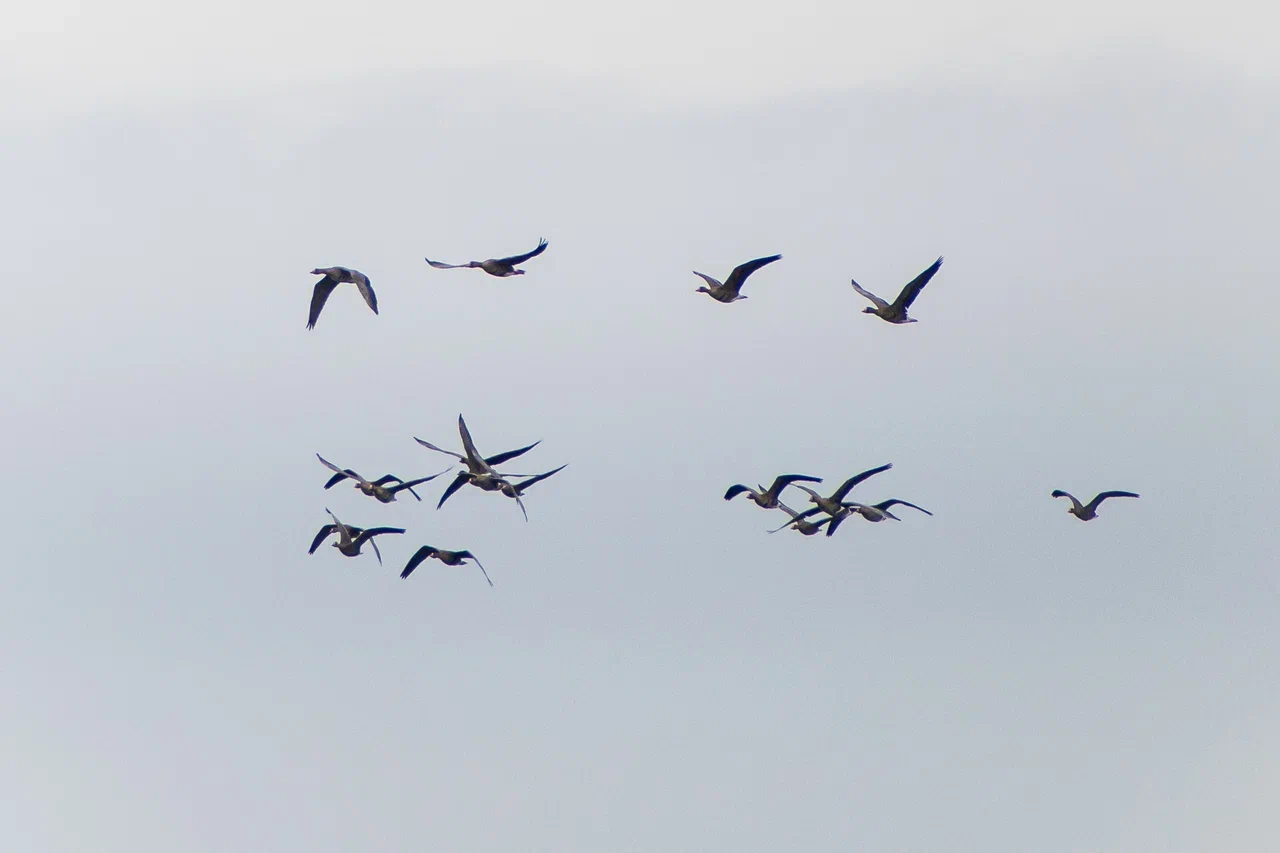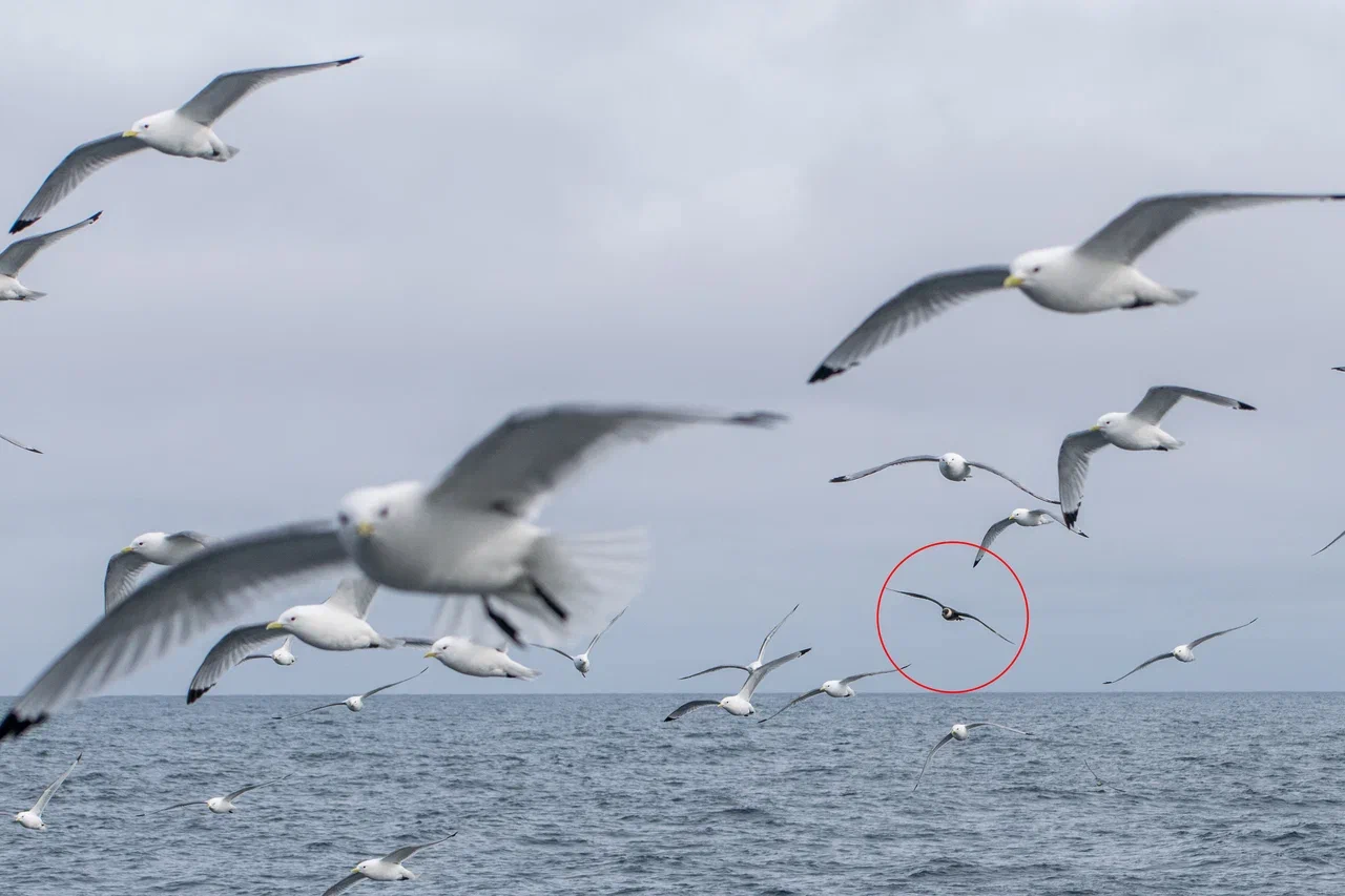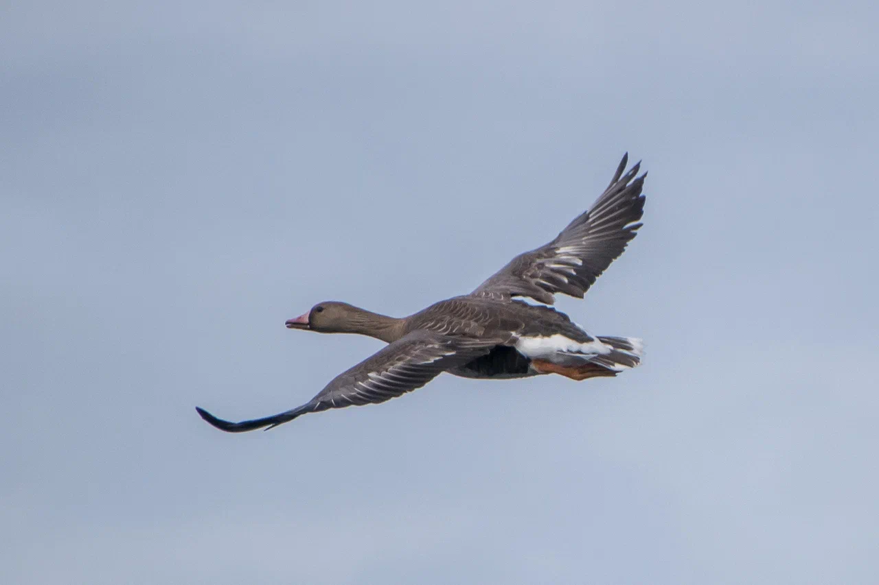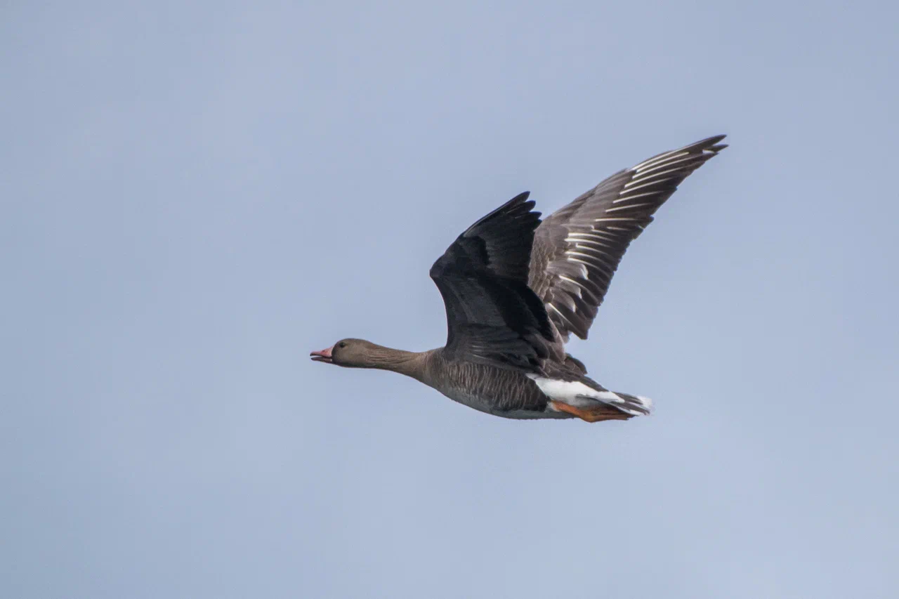 Однажды, стоя на палубе, я заметил в небе что-то массивное, быстро приближающееся к нашему судну. Мы работали в 50 км от берега в Байдарацкой губе. Присмотревшись, я увидел силуэт белолобого гуся, который почему-то пролетел прямо над верхней палубой, да ещё и сделал круг над нами. У первогодков белого пятна на лбу нет, лоб становится белым на второй год. Вообще, большинство перелётных птиц старается держаться подальше от проходящих судов, не давая хорошенько себя разглядеть и сфотографировать. Вероятно сказывается генетическая память, ведь на протяжении многих лет птицы становились добычей северных моряков. Особенно гуси.