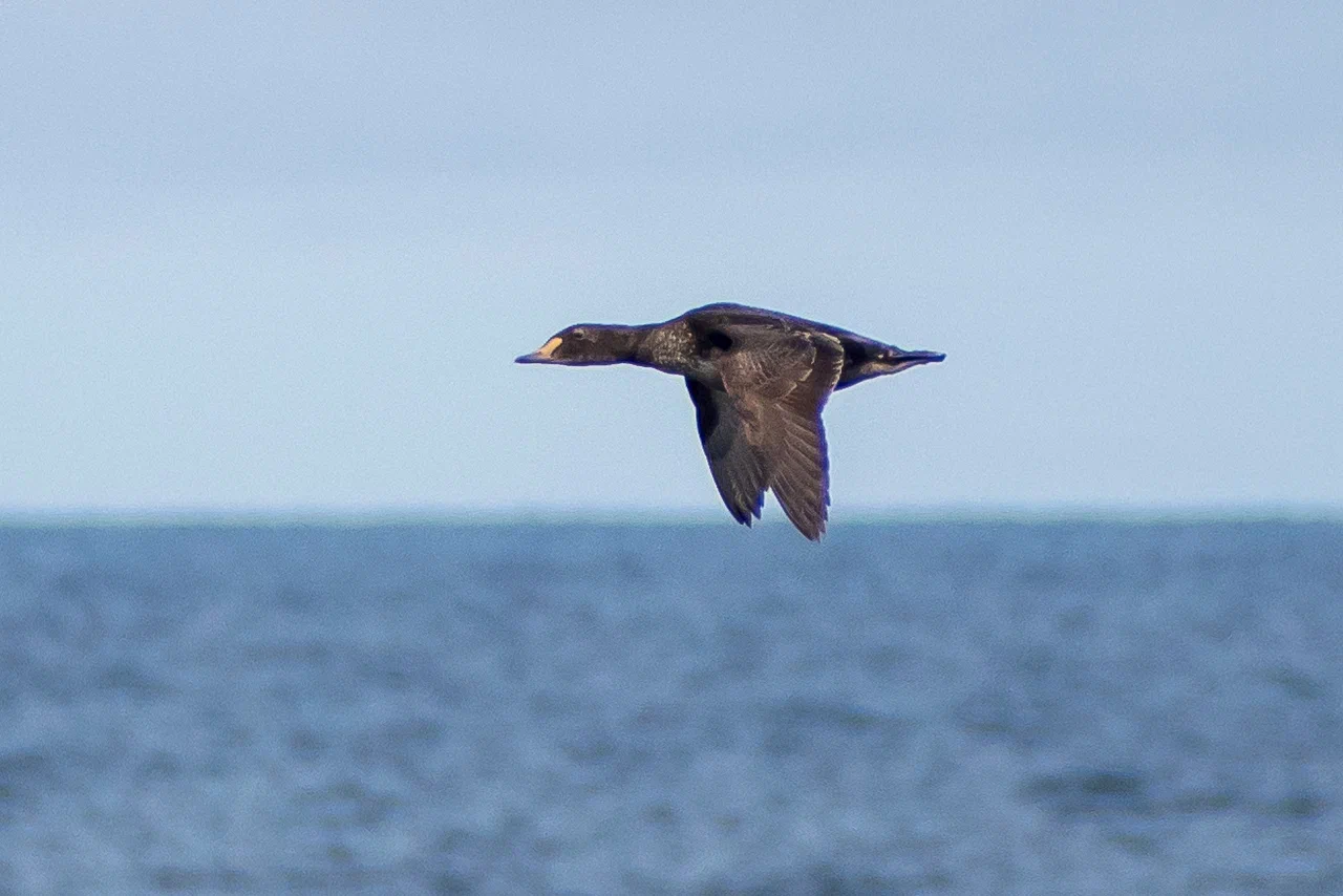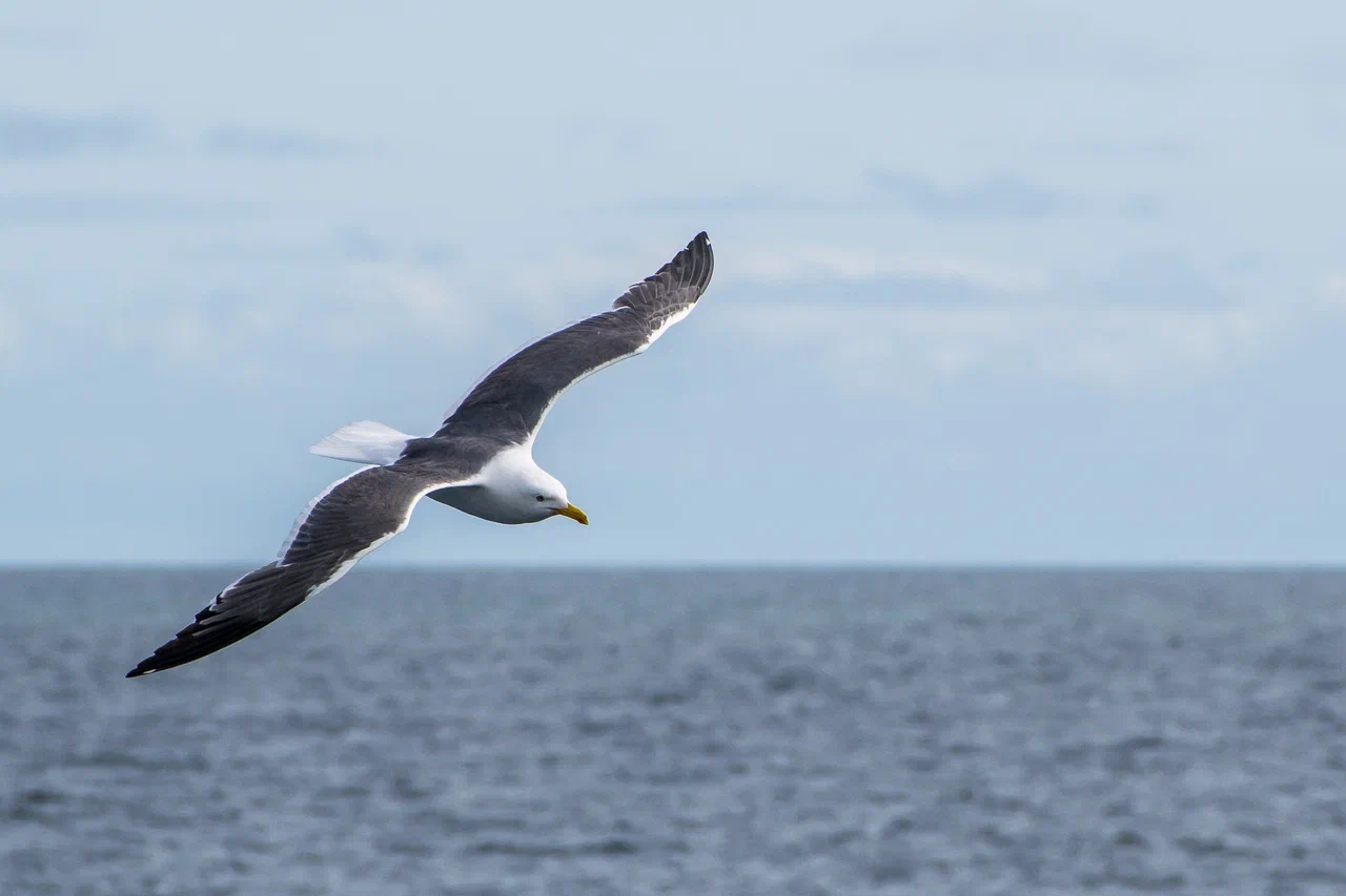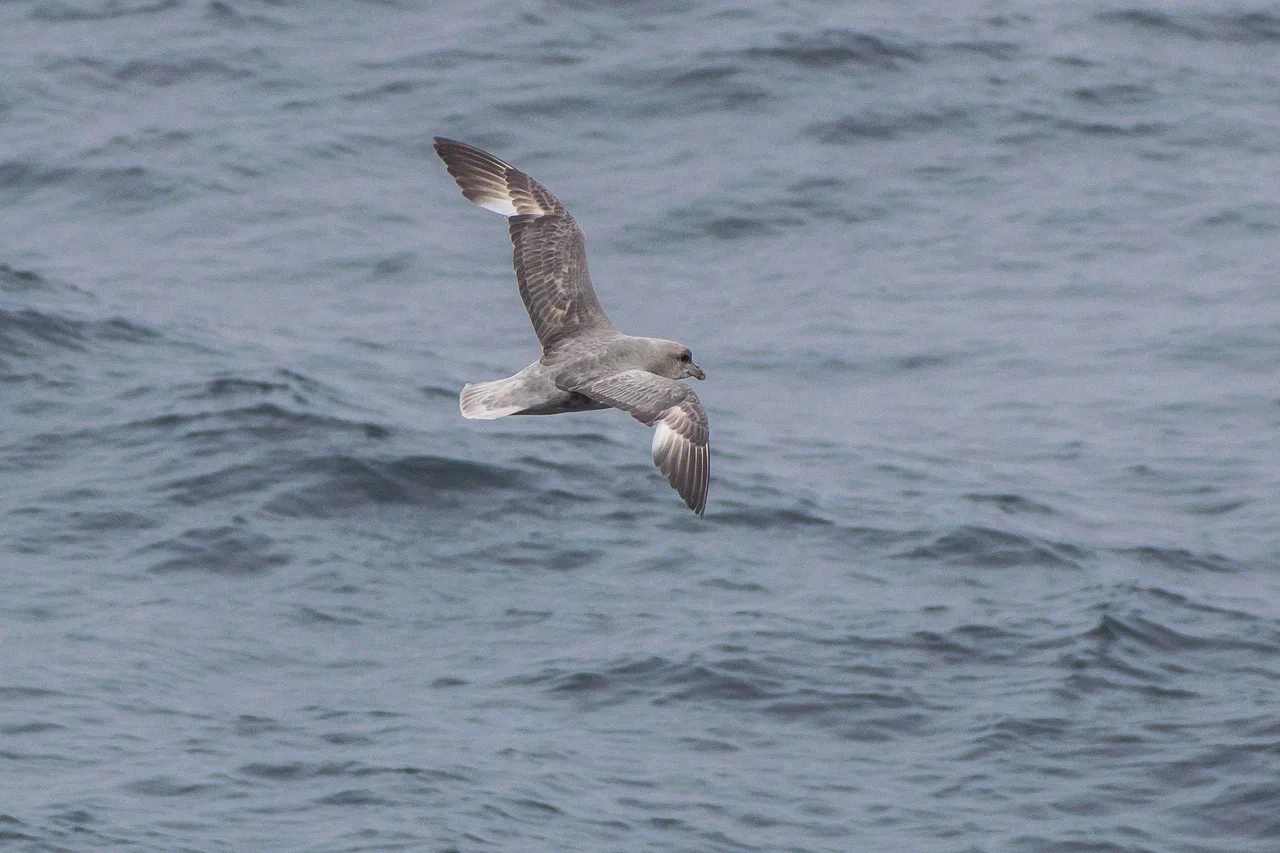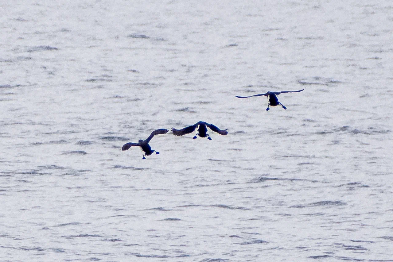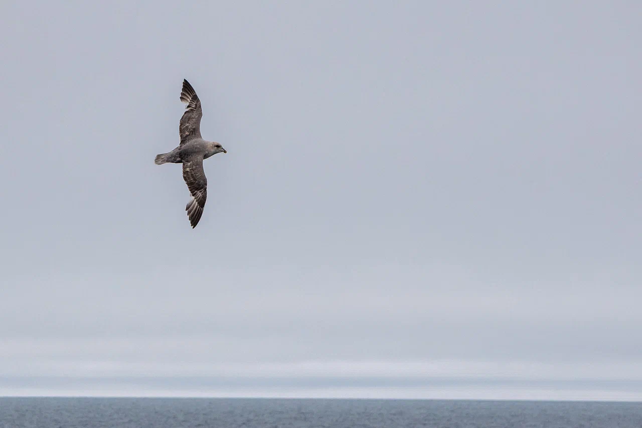 Однажды, стоя на палубе, я заметил в небе что-то массивное, быстро приближающееся к нашему судну. Мы работали в 50 км от берега в Байдарацкой губе. Присмотревшись, я увидел силуэт белолобого гуся, который почему-то пролетел прямо над верхней палубой, да ещё и сделал круг над нами. У первогодков белого пятна на лбу нет, лоб становится белым на второй год. Вообще, большинство перелётных птиц старается держаться подальше от проходящих судов, не давая хорошенько себя разглядеть и сфотографировать. Вероятно сказывается генетическая память, ведь на протяжении многих лет птицы становились добычей северных моряков. Особенно гуси.