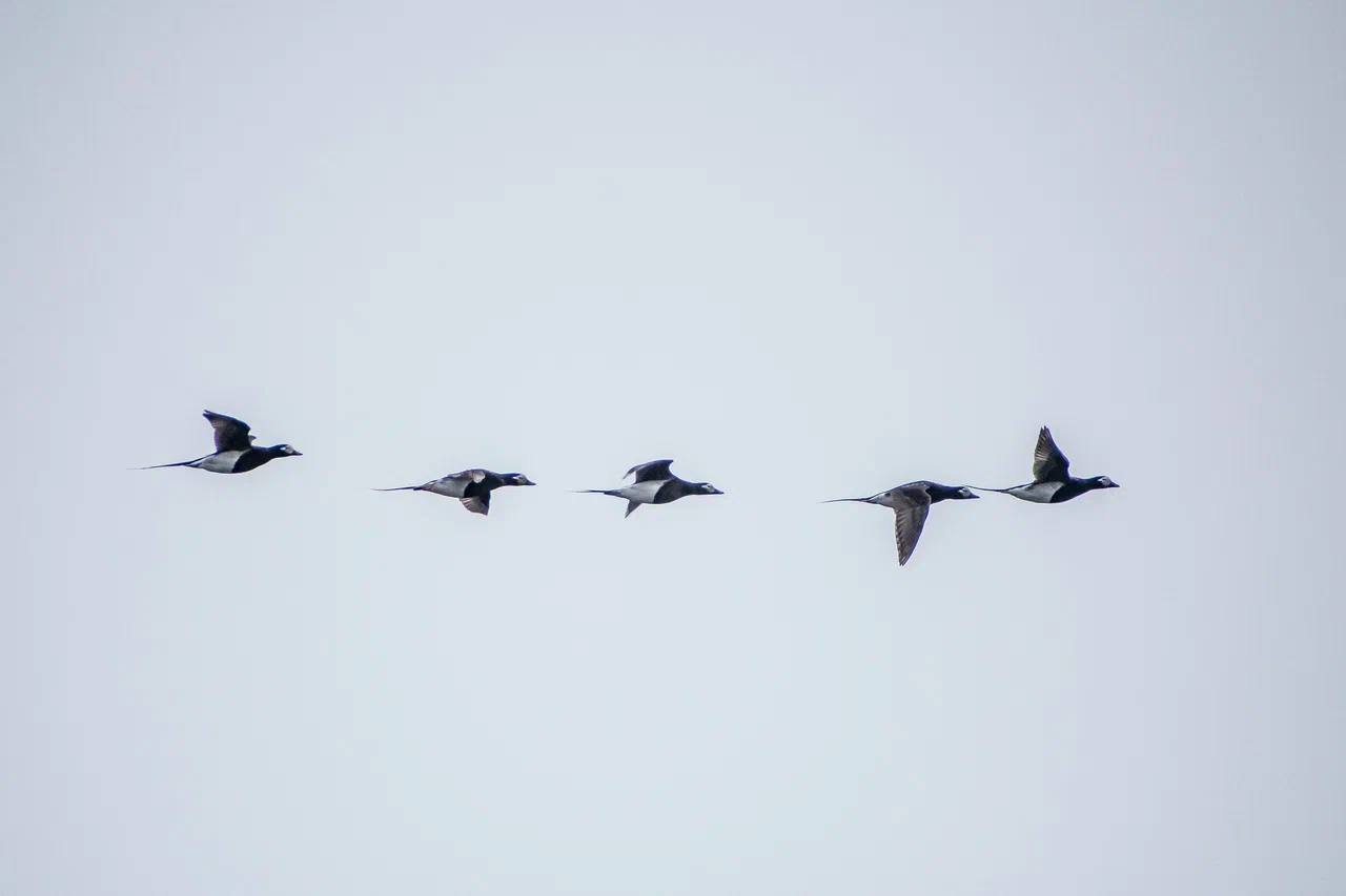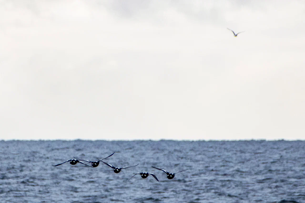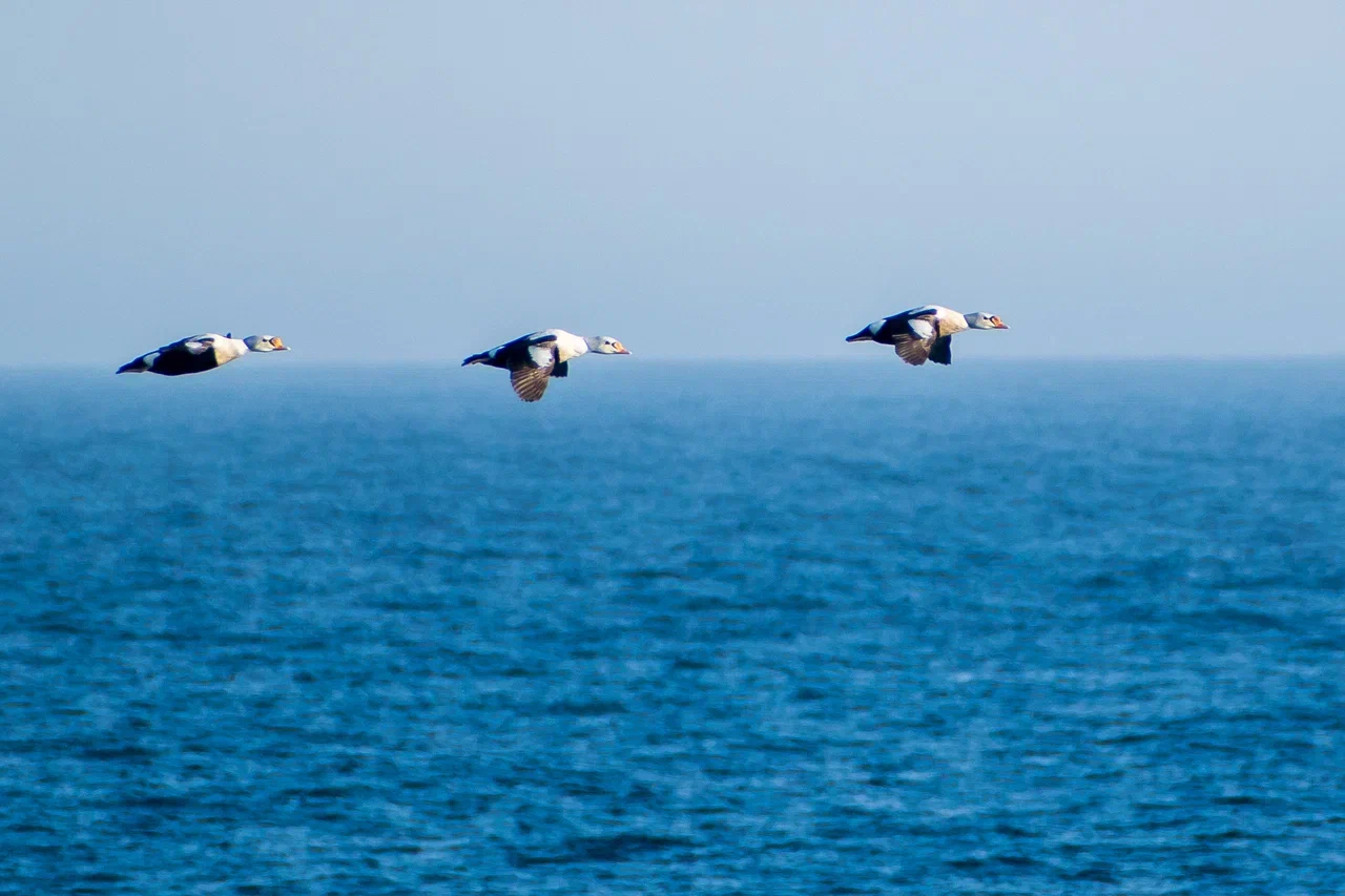 Наиболее яркими и необычными среди этих стайных птиц были гаги-гребенушки. Самцы этой морской утки, гнездящейся в арктической тундре, имеют очень яркую окраску: голубую шею, зелёные щеки, красный клюв, жёлто-оранжевый лоб, а еще розоватую грудь и чёрно-белое тело. Чёрный клюв образован так, будто птица улыбается. Интересно устроено оперение хвостовой части гребенушки. Вероятно, яркие пятна позволяют лучше видеть впереди летящих самцов и лучше держать стаю. Ну а самка окрашена очень просто, у неё бледно-коричневое оперение.