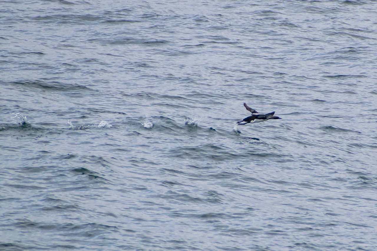 Иногда мимо нашего судна пролетали изящные гагары. Мелкая и стройная краснозобая гагара отличается тонкой шеей и тонким несколько вздёрнутым клювом. Она зимует в солёной воде, да и лето проводит вблизи моря. Чернозобая гагара крупнее краснозобой. В брачном наряде окраска характерна: голова и шея пепельно-серые, спина имеет шахматный рисунок белых четырёхугольных пятен.