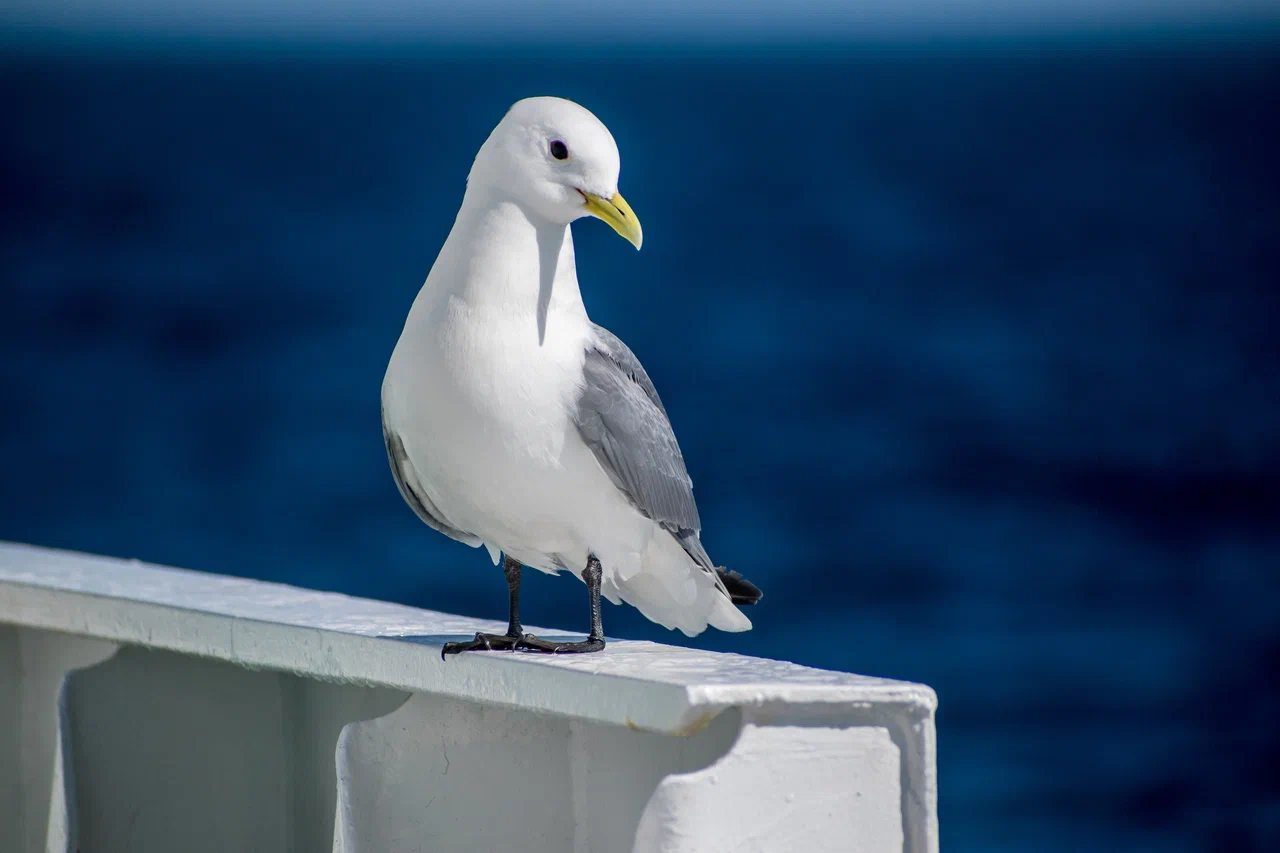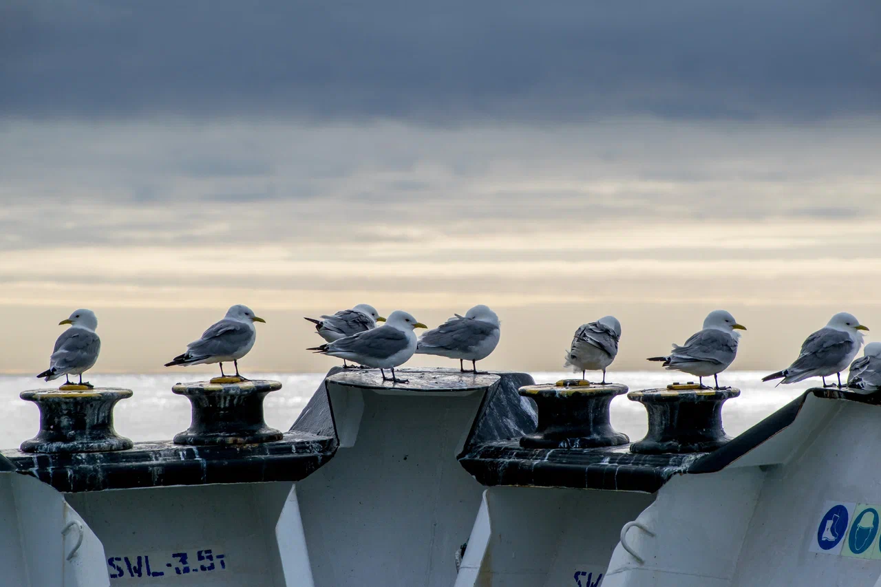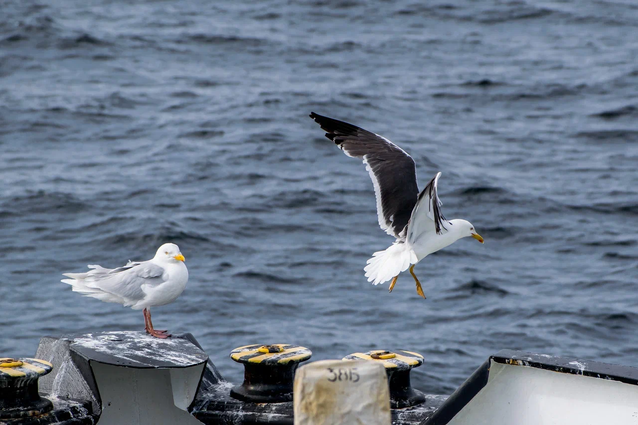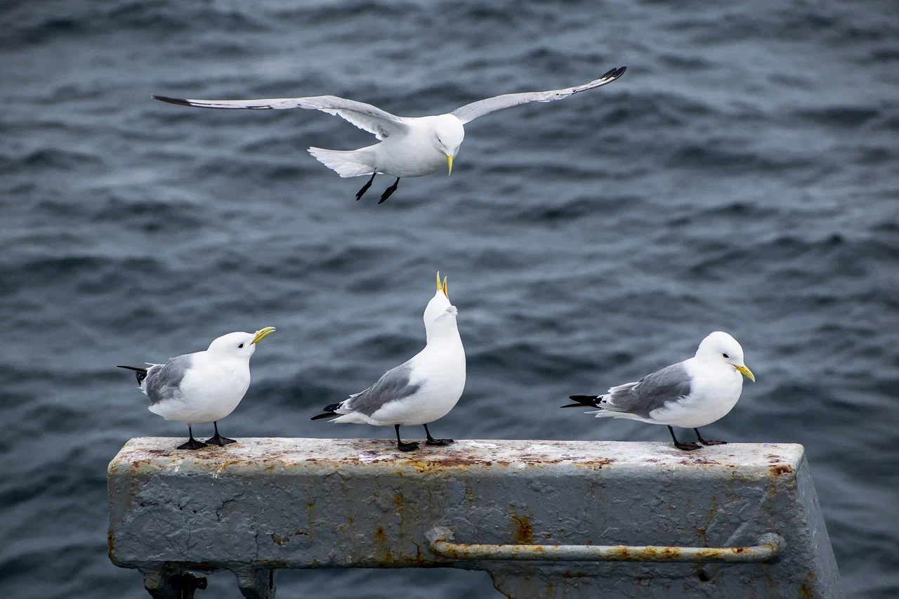 Как и в Баренцевом море, здесь повсеместно нас преследовали чайки моевки. В самую ненастную погоду они ненадолго исчезали, но вскоре появлялись снова, заняв свои места по борту нашего судна. Моевки – весьма безобидные птицы, но порой они бывают очень склочными. Пытаясь занять лучшее место на носу корабля, они готовы спорить друг с другом и гонять своих собратьев прочь, не давая усесться рядом.