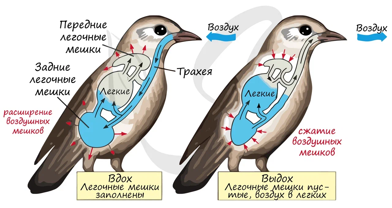 Когда наблюдаешь, как быстро птицы машут крыльями, невольно задаешься вопросом: как же нужно часто дышать, чтобы хватало кислорода на такое активное движение? Но у птиц есть свой секрет, связанный с дыханием. Лёгкие птиц практически нерастяжимы, но несмотря на свои небольшие размеры, они пропускают через себя больше воздуха, чем лёгкие млекопитающих. Дело в том, что лёгкие у птиц соединены с воздушными мешками, которые располагаются между внутренними органами птиц. При вдохе птица наполняет задние воздушные мешки, а при выдохе опустошает передние мешки. При этом воздух предыдущего вдоха прокачивается через легкие, снабжая их кислородом. Таким образом, из задних воздушных мешков в легкие птицы свежий воздух поступает и на вдохе, и на выдохе, в два раза интенсивнее обогащая кровь птицы кислородом. Такое двойное дыхание позволяет птицам летать на очень большой высоте. Там мало кислорода, но птицы его очень эффективно усваивают.