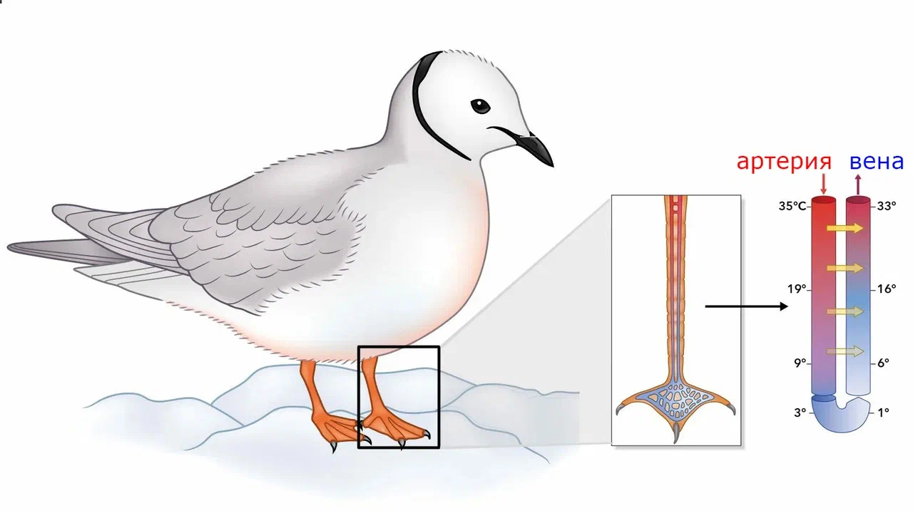 Когда смотришь на тонкие лапки птиц, которые прилетают и садятся на борт арктических судов, невольно съеживаешься от холода, потому что даже летом температура тут редко поднимается намного выше нуля градусов и металл под их лапками кажется ледяным. Эти тонкие птичьи пальчики вот-вот превратятся в льдинки и уже никогда не отогреются. Почему же они сидят и не мёрзнут? Оказывается, у птиц есть отличный механизм согревания. Большая часть птичьей ноги, где проходят мышцы, покрыта перьями и находится в тепле. А дальше между голенью и пальцами идёт длинная обтянутая кожей кость под названием цевка. Вдоль неё идут сухожилия, и уже нет таких плотных мышц, которые могли бы легко замёрзнуть. А ещё рядом с веной тут проходит артерия с очень горячей кровью, идущей от сердца. Вот поэтому ножки и не мёрзнут – остывшая венозная кровь тут же согревается горячей артериальной. А у нас с вами всё не так: ноги и руки покрыты мышцами с большим количеством капилляров, поэтому и сидеть так на морозе мы не можем.