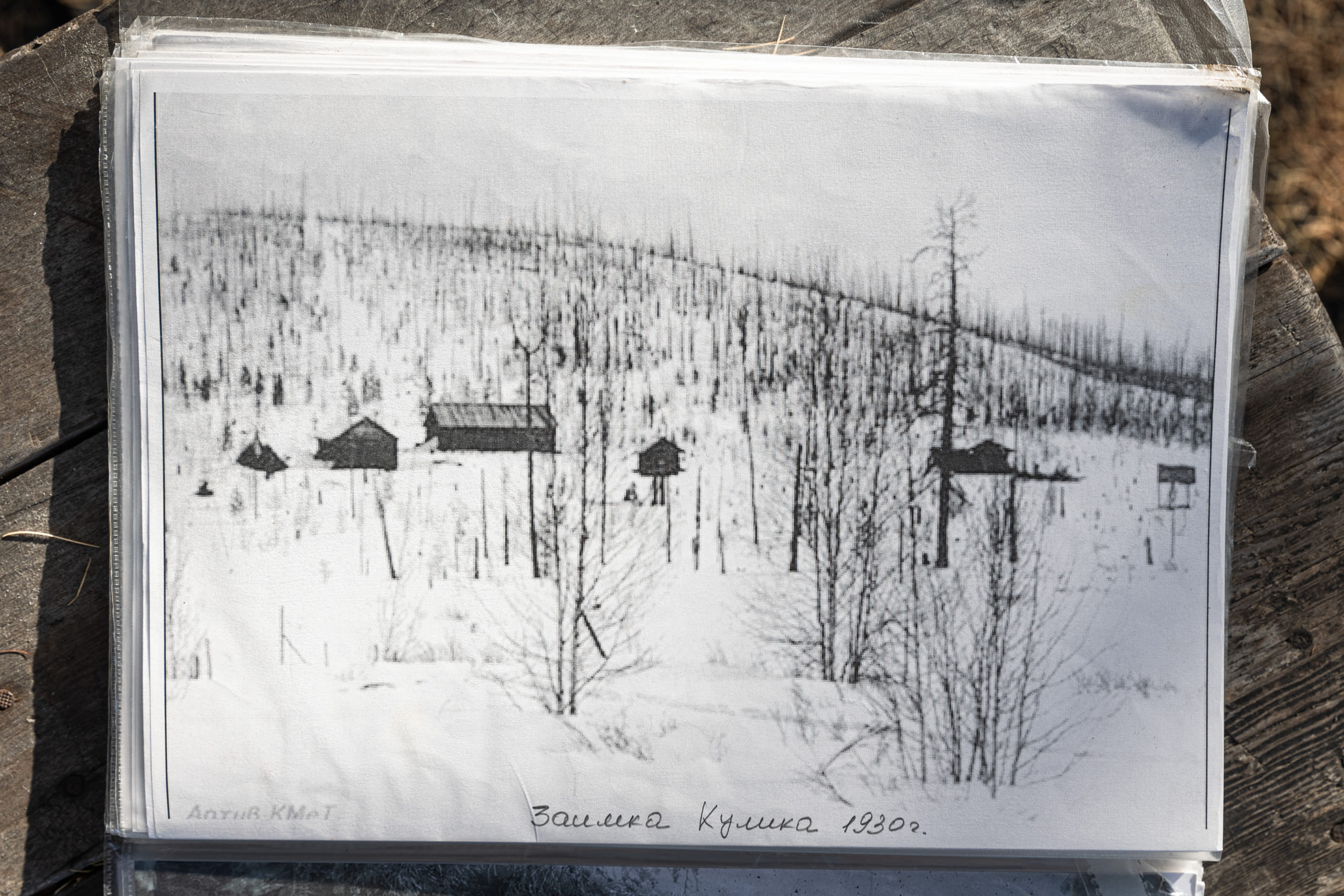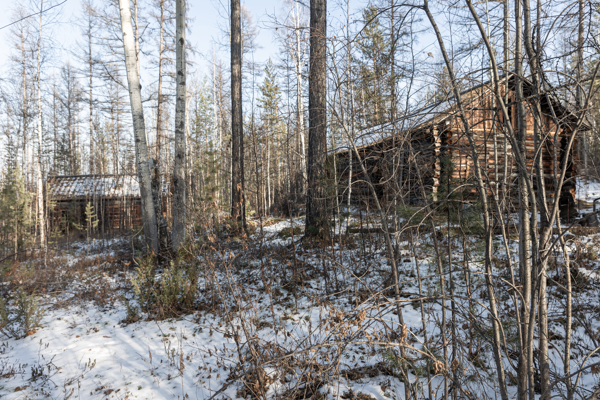 Заимка Кулика сейчас. Все срубы сохранились именно на том месте, где их построила экспедиция Леонида Кулика в 1927 году. Сохранилась командорская изба, рабочая изба и лабаз, разрушилась только кузница.
