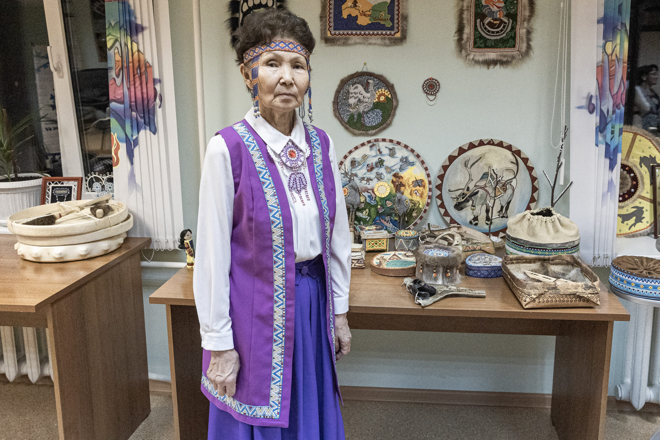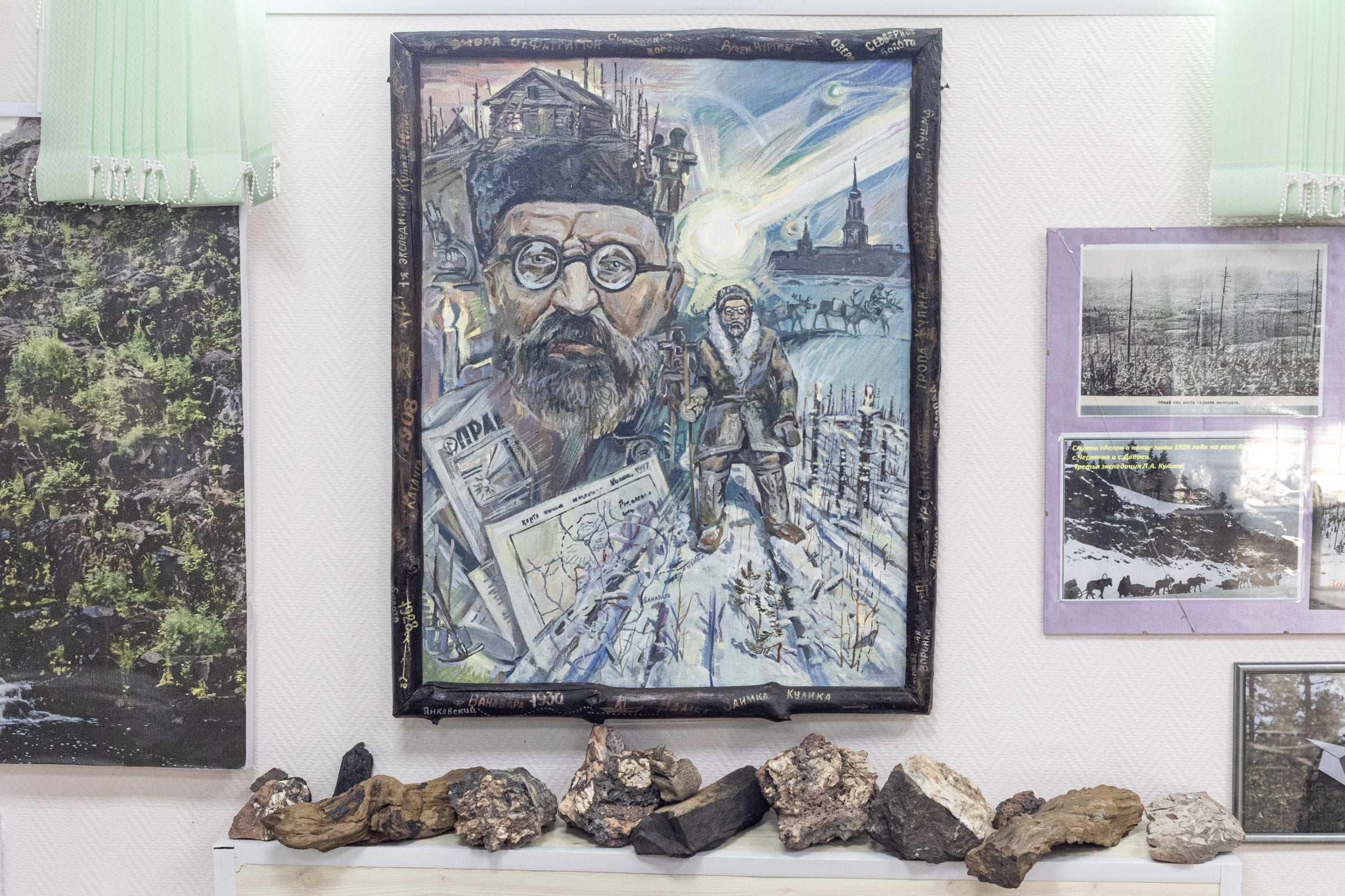 Картины, фотографии и предметы, связанные с экспедициями Леонида Кулика. Экспозиция Ванаварского филиала Эвенкийского краеведческого музея.