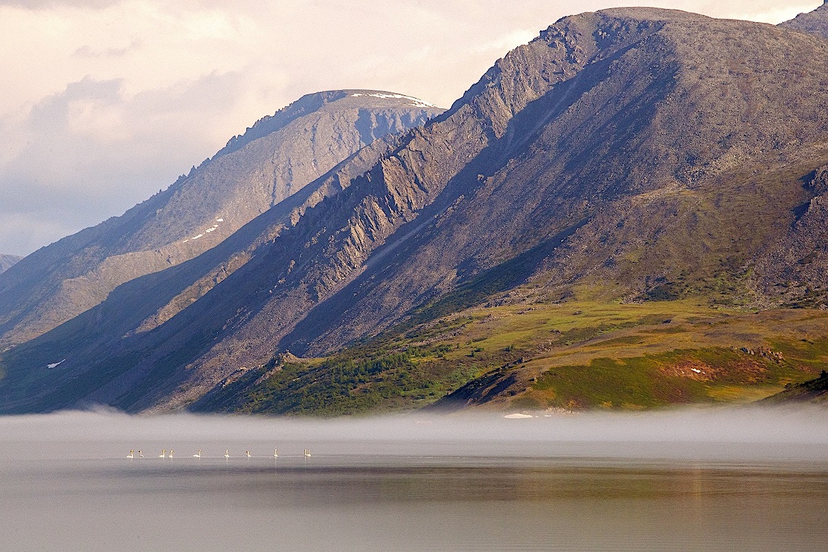 Стая лебедей на Большом Щучьем озере в парке «Ингилор». Фото из четвертого альбома проекта – «Заповедный Ямал. Душа ледяного озера». Источник: yamburg-dobycha.gazprom.ru