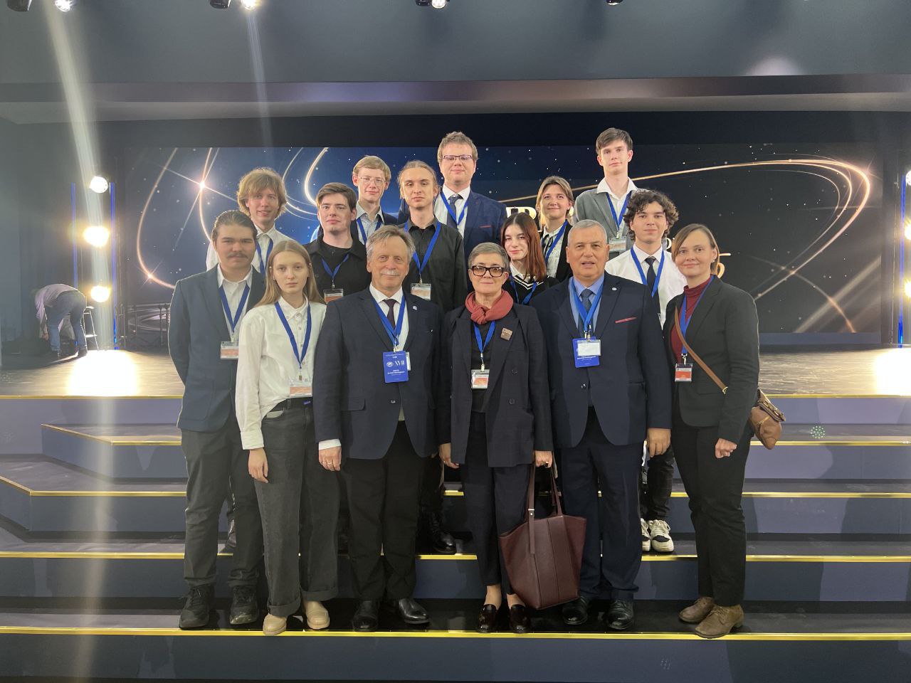 Со студентами, деканом факультета географии МГПУ Е.В. Филатовой и профессором А.А. Лобжанидзе на XVII Съезде РГО, Москва, 2025 г.