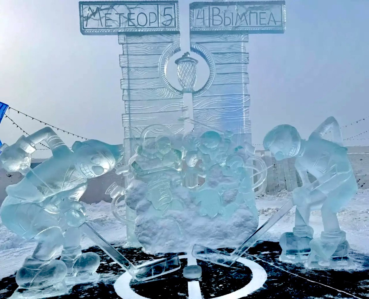 Второе место и приз в 150 тыс. рублей присудили команде «Золотые крылья» за ледяную композицию по мотивам мультфильма «Оранжевая корова».