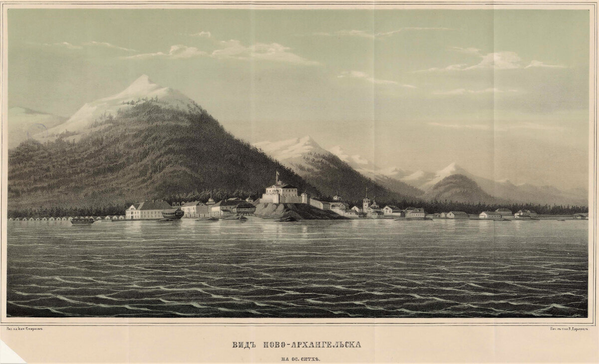 Ново-Архангельск. Иллюстрация из Отчета Российско-Американской компании за 1858 год. Источник: dzen.ru
