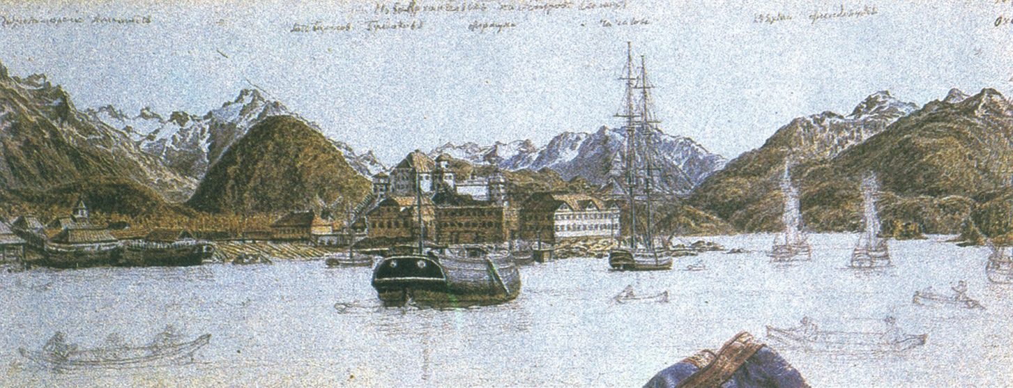 «Вид российско-американского селения в Ситхинском заливе в Америке». Рисунок Чернышева. 1809 г.