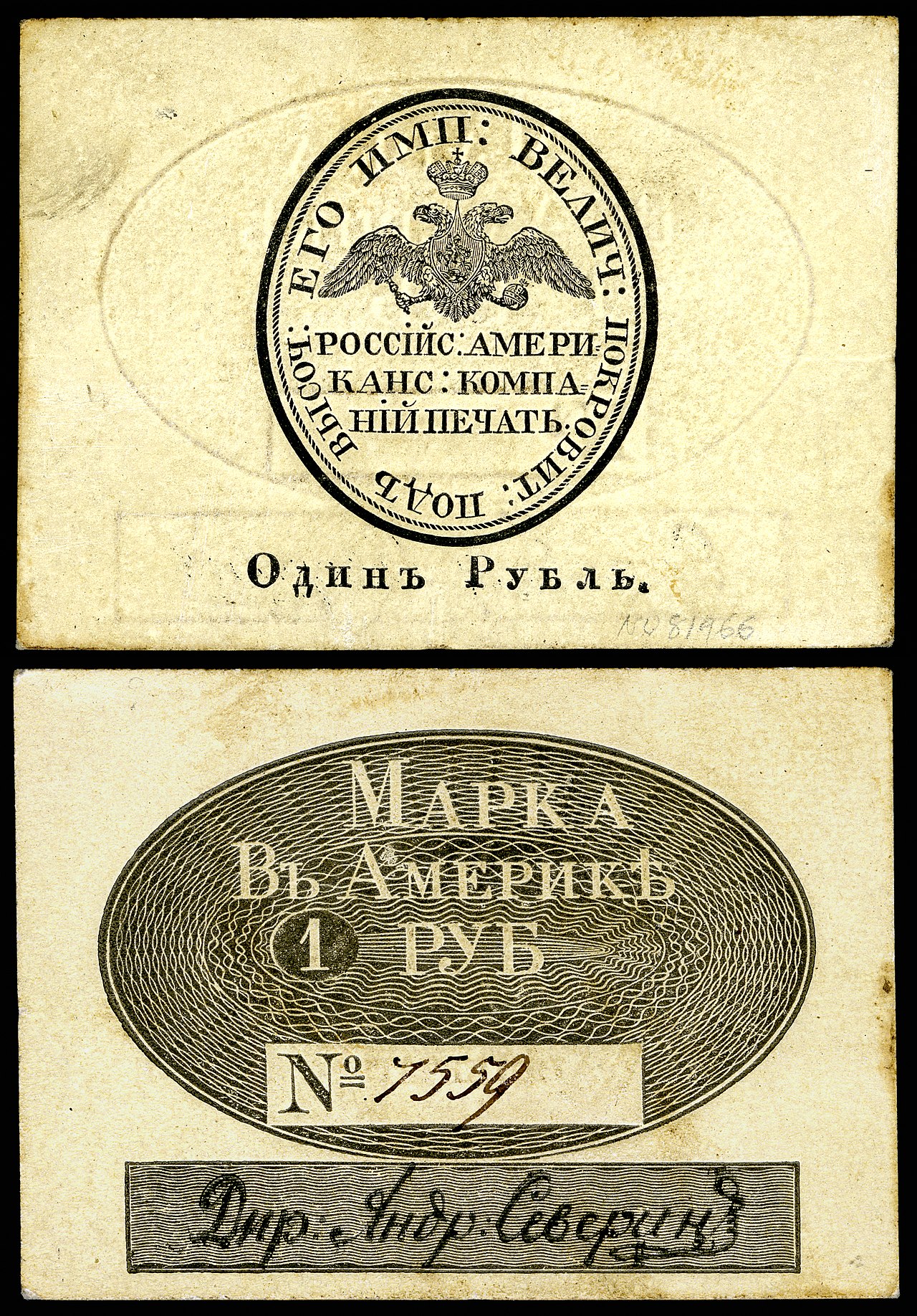 Марка в 1 рубль, напечатанная Российско-американской компанией для Аляски. Введена в 1816 г. Изъята в 1868 г.