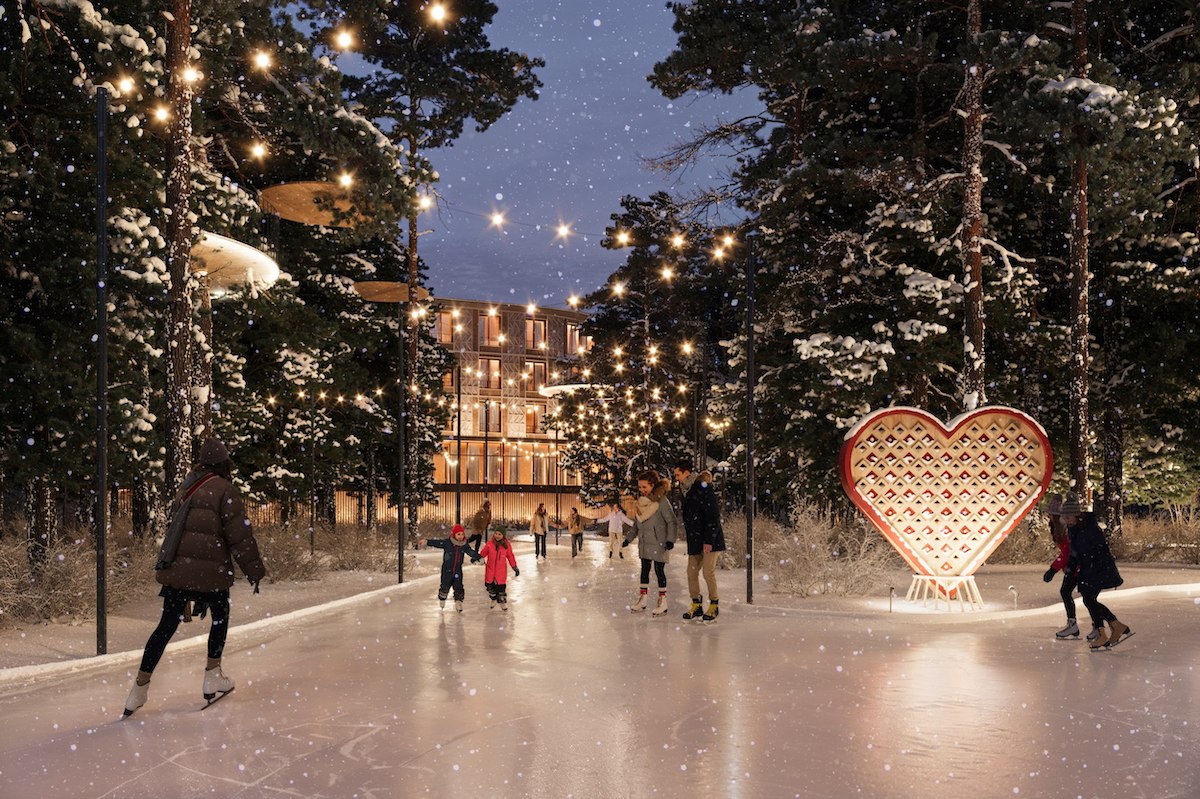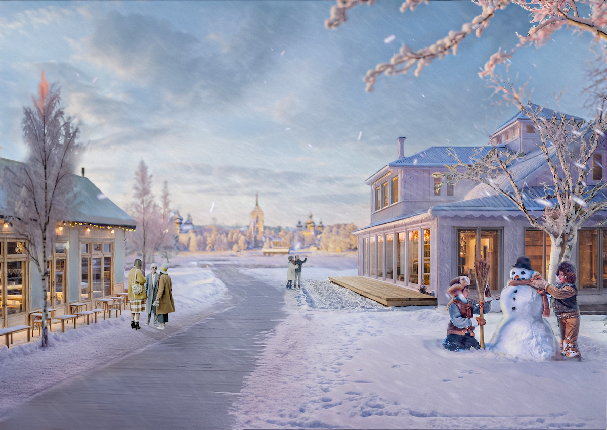«Великий Устюг сейчас – это место зимнего отдыха, родина Деда Мороза и сказочная столица России. Задача проекта – превратить Великий Устюг из сезонной «родины Деда Мороза» в круглогодичное направление. Для этого создается многофункциональный парк-отель в 15 минутах езды от города. Главная особенность – многоформатная архитектура. Территория разделена на тематические зоны с разными типами размещения: глэмпинг, коттеджи со спа, отель, таунхаусы. Композиционным центром становится открытое «Поле» – событийное пространство с амфитеатром и арт-объектами. Архитектура каждого кластера обладает уникальным, но узнаваемым образом, объединённым общей концепцией парка-отеля».