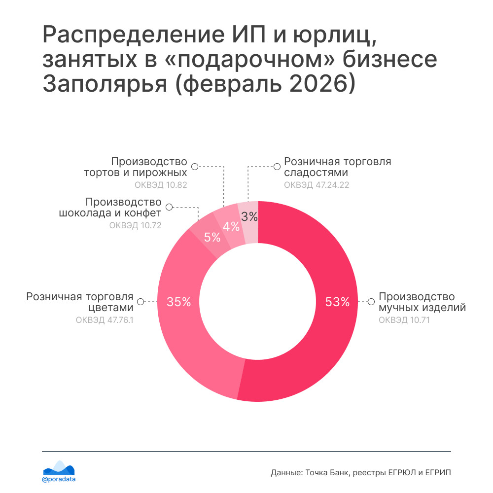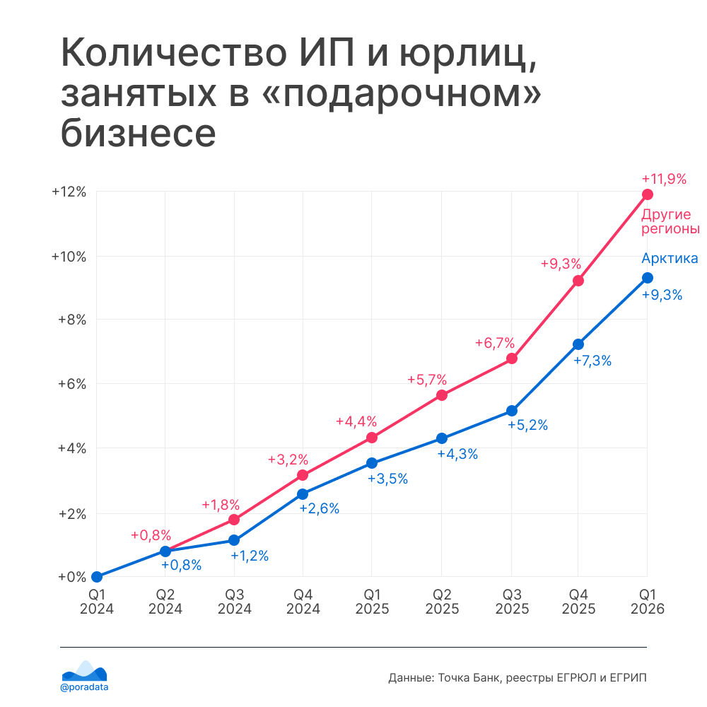 Для многих Крайний Север традиционно ассоциируется с тяжелой промышленностью и добычей полезных ископаемых. В этом свете особенно интересно узнать, как себя чувствует малый бизнес, работающий в Заполярье. Проект «ПОРА считать» и аналитики Точка Банка решили посмотреть, как развивается «подарочный» сектор экономики Арктики (пекарни, кондитерские производства, торговля шоколадом и цветами), сравнив его с динамику с общероссийскими трендами. Делимся своими находками и наблюдениями с читателями GoArctic.