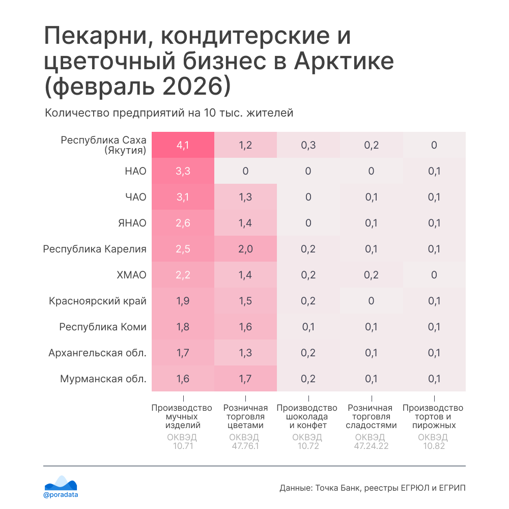 Отдельно стоит отметить Ненецкий автономный округ. Там всего 14 пекарен и это, казалось бы, совсем немного. Но в пересчете на численность населения получается 3,3 пекарни на 10 тыс. человек, что выводит регион на второе место в Арктике по этому показателю.