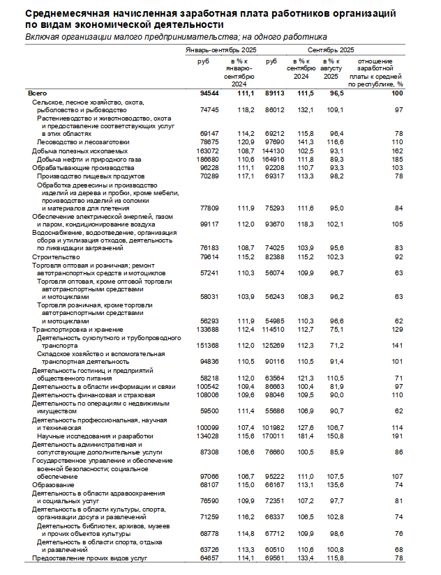 В Республике Коми в сентябре 2025 года наибольшая среднемесячная начисленная зарплата отмечена в сфере «Научные исследования и разработки» – 170 011 рублей. На втором месте – добыча нефти и природного газа: специалисты отрасли получили осенью в среднем 164 916 рублей. Такие данные передаёт ИА «Комиинформ» со ссылкой на информацию Комистата, приведённую в докладе о социально-экономическом положении республики за январь-октябрь 2025 года.